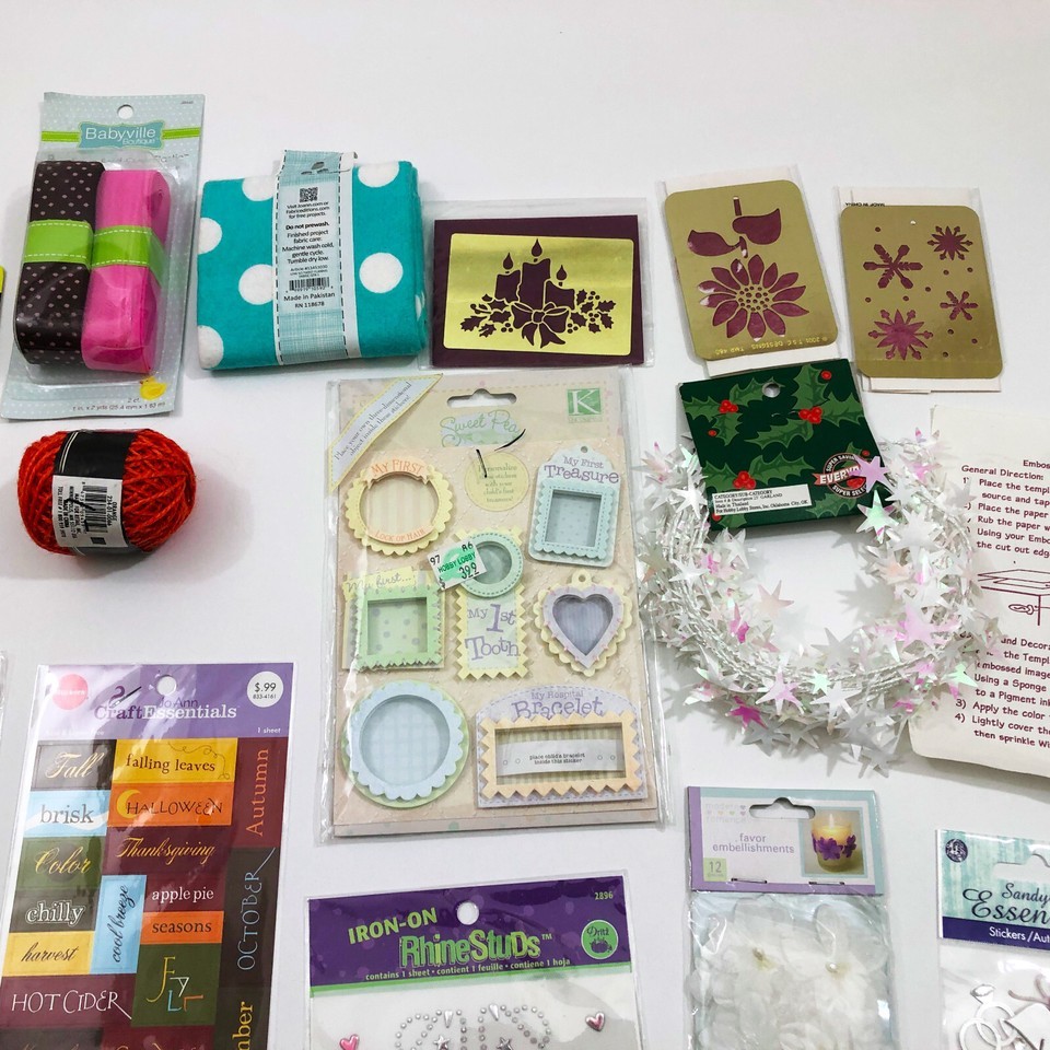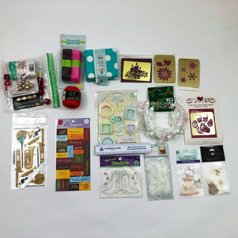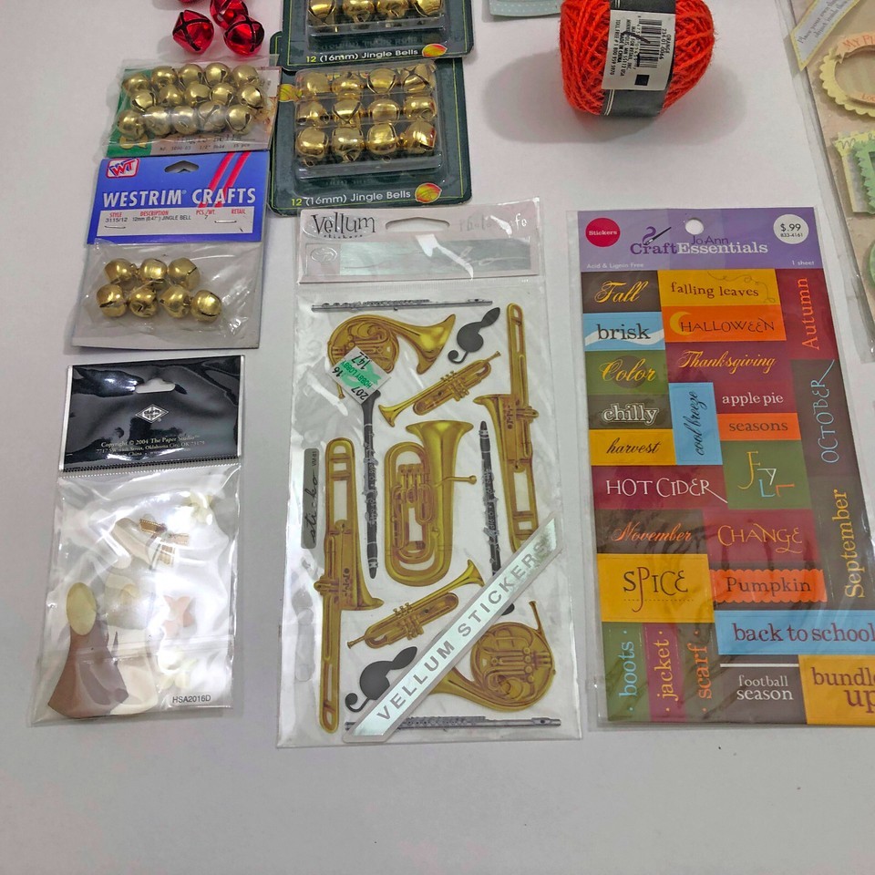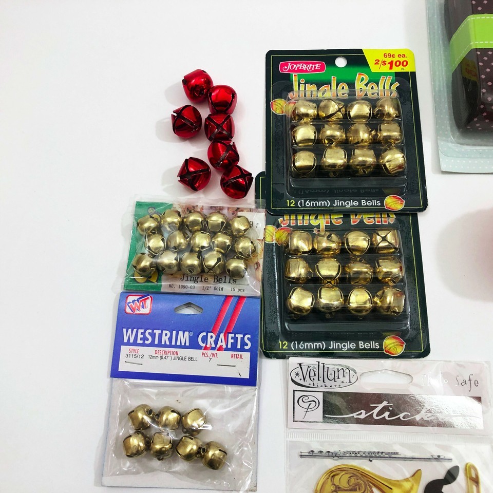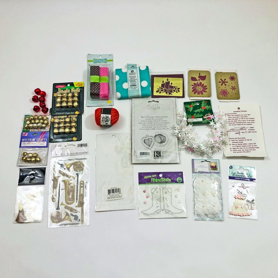 Assortment of Crafting Items Wreath Jingle Bells Ribbon Stencils Stickers Plus