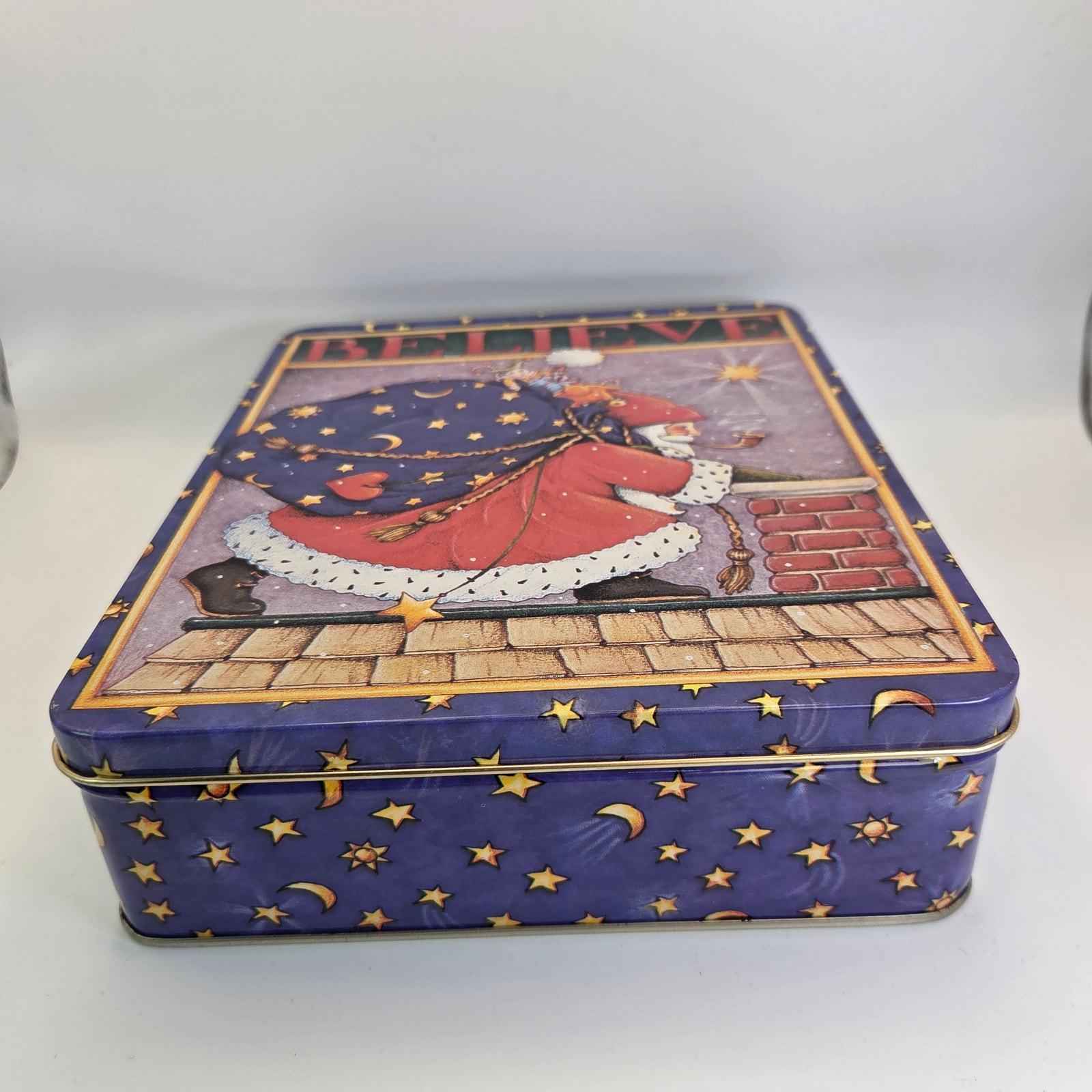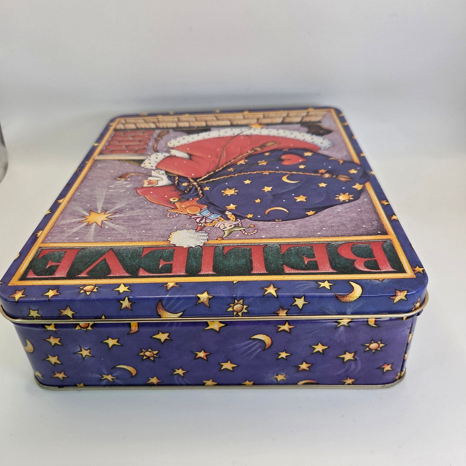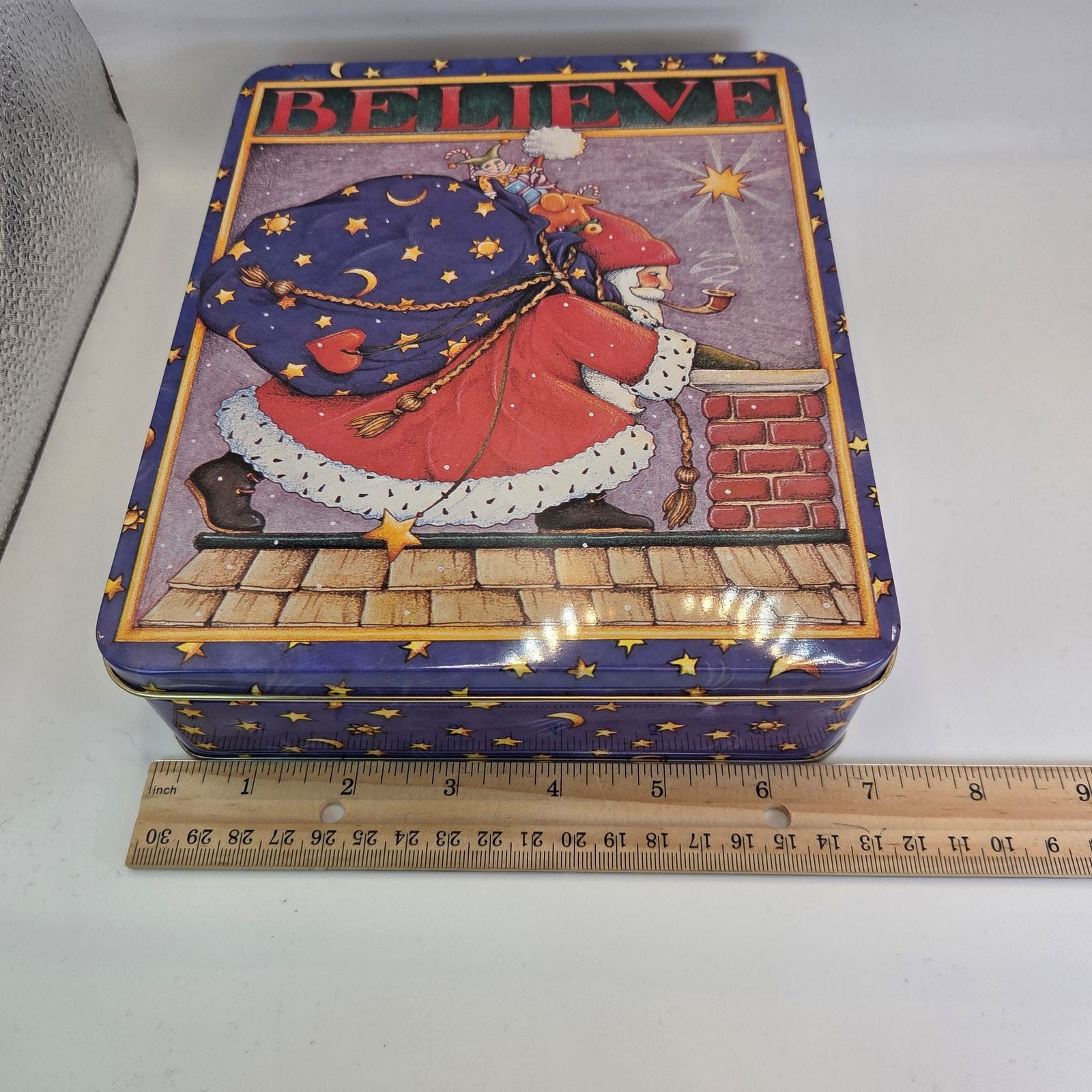 Charming vintage Mary Engelbreit "Believe" Christmas tin, dated 1986 and licensed by Midwest Importers of Cannon Falls. Features a whimsical Santa carrying a starry sack of toys, climbing into a chimney with pipe in hand. The tin is richly decorated with Engelbreit?s signature style, accented with moons, stars, and playful holiday details.