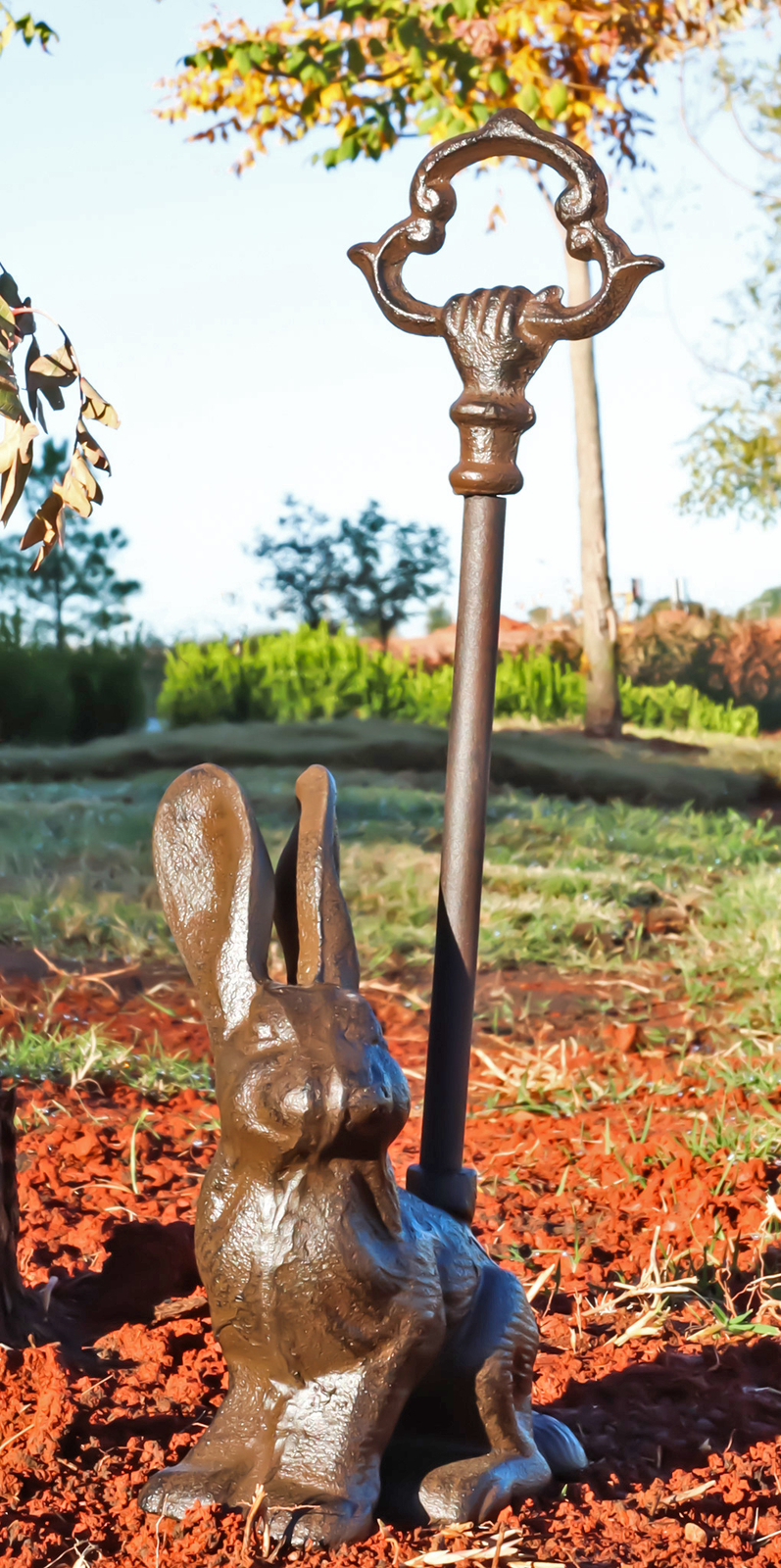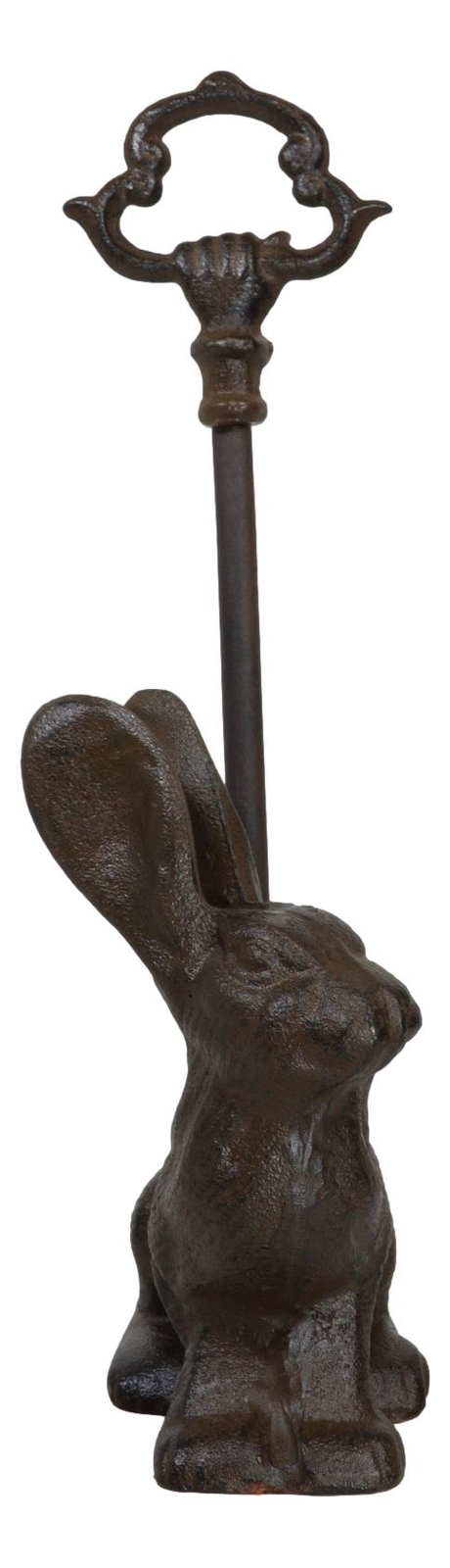 ? Ensure your door stays ajar (or securely shut) during breezy days with the help of our amiable rabbit door porter. This innovative take on the traditional doorstop features an extended handle for effortless repositioning, allowing you to move it from one door to another with ease. With its intricate, full-bodied design, appealing antique rust finish, and charming French Country style, this clever home accent combines both form and function.