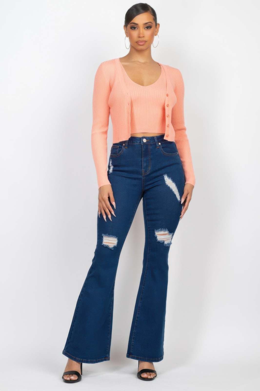 Two-piece set: ribbed crop tank top and matching cardigan