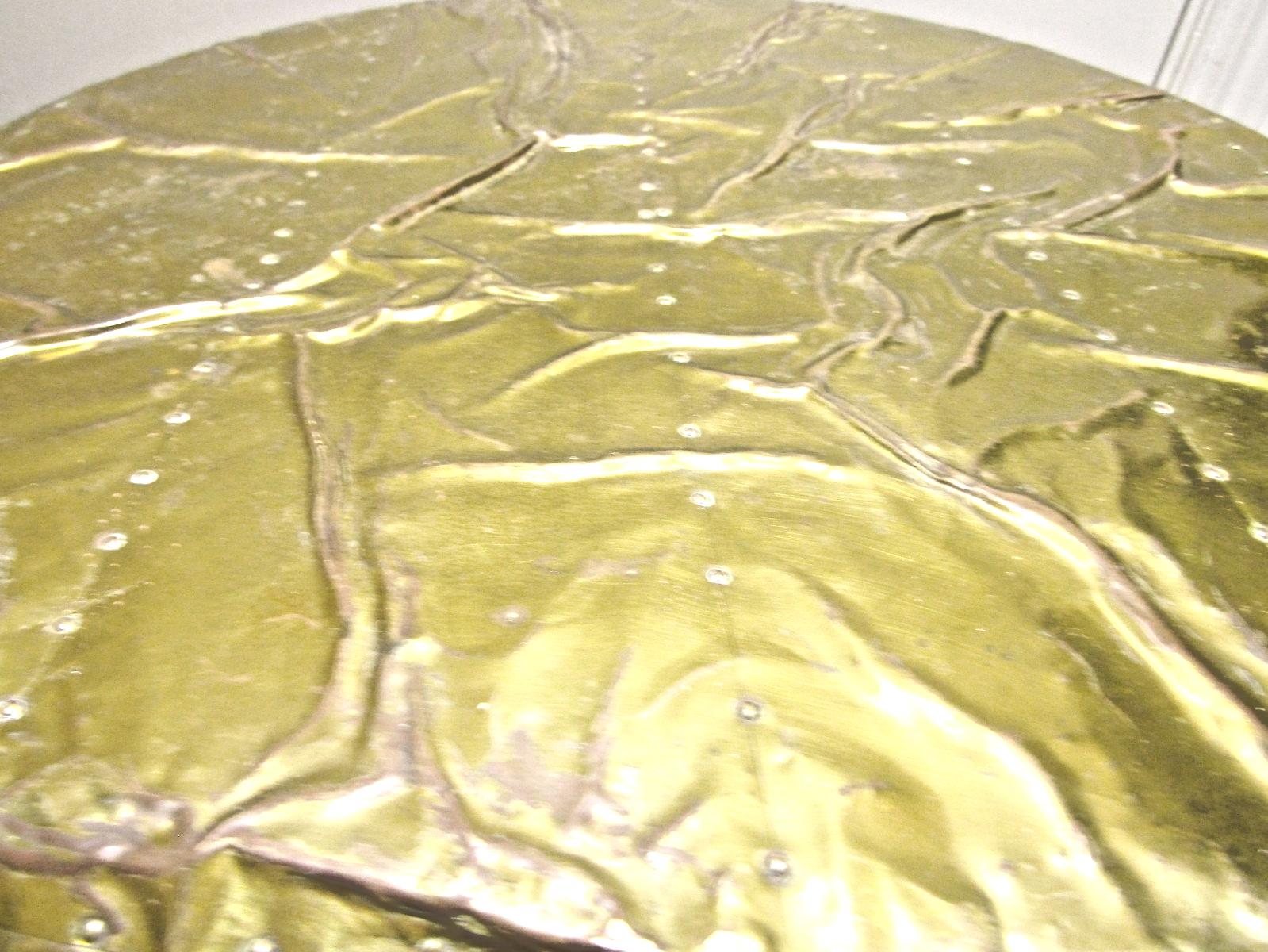 This rare vintage pair of Arthur Court patchwork brass over wood side tables from 1980 features a unique spiral circular shape with a gold color and shiny finish. The tables are made of brass tabletop material with a wood base, reflecting the 1980s style. With no tools required for assembly, these indoor tables are a functional and decorative addition to any home, showcasing the signature spiral theme of the Arthur Court brand.