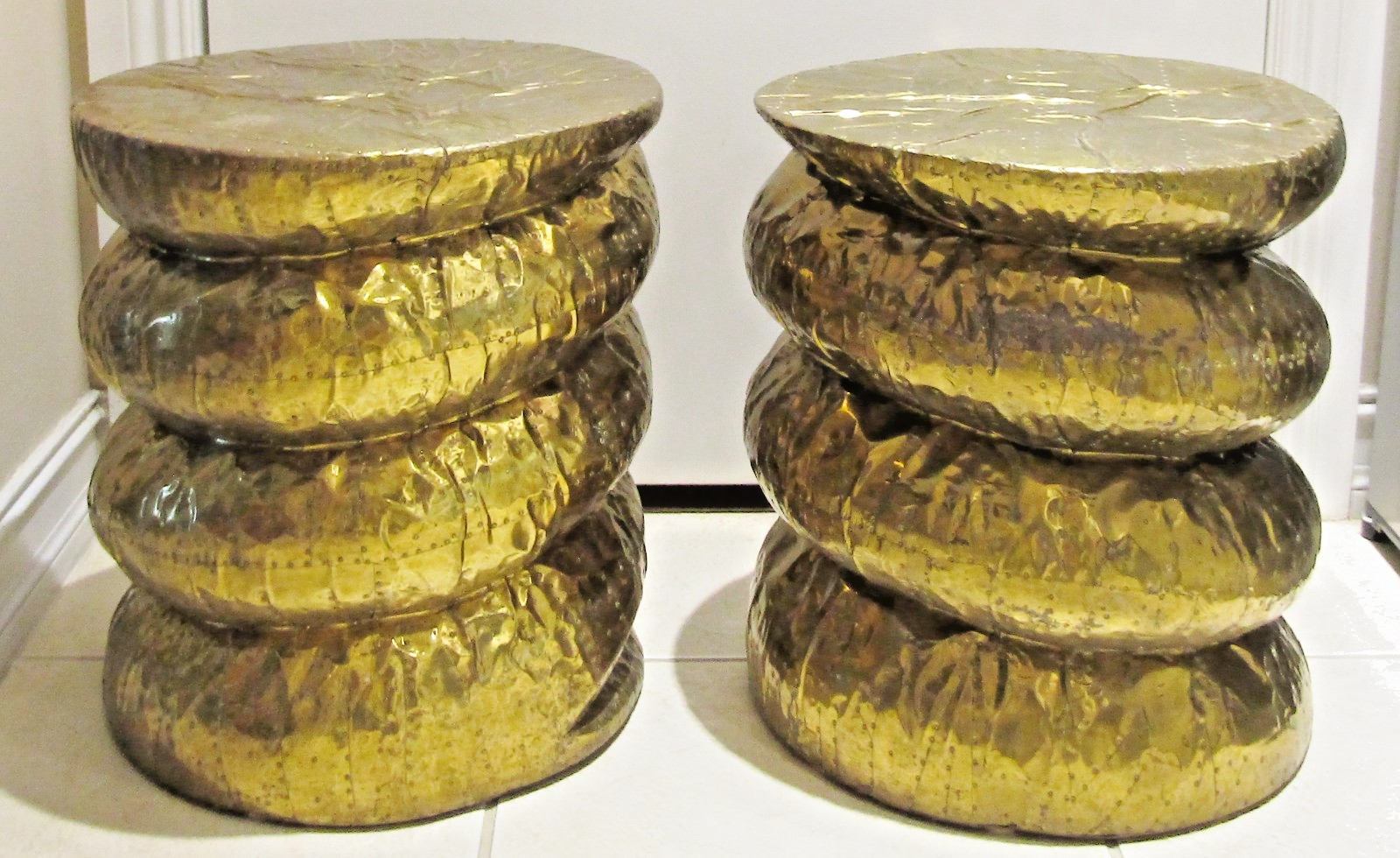 Hand carved spiral solid wood covered with brass patches set with nails. Each were made in the Philippines and one has the Arthur Court Designs 1980 metal tag.