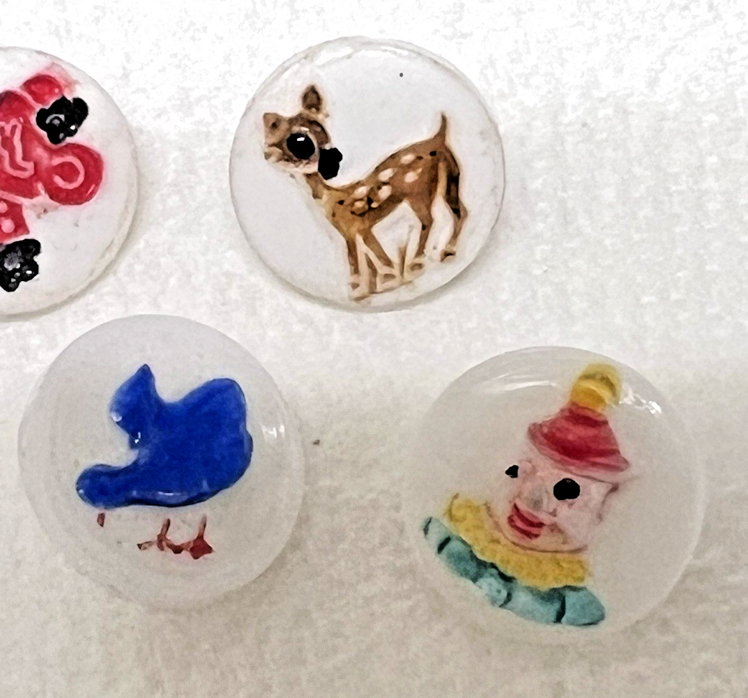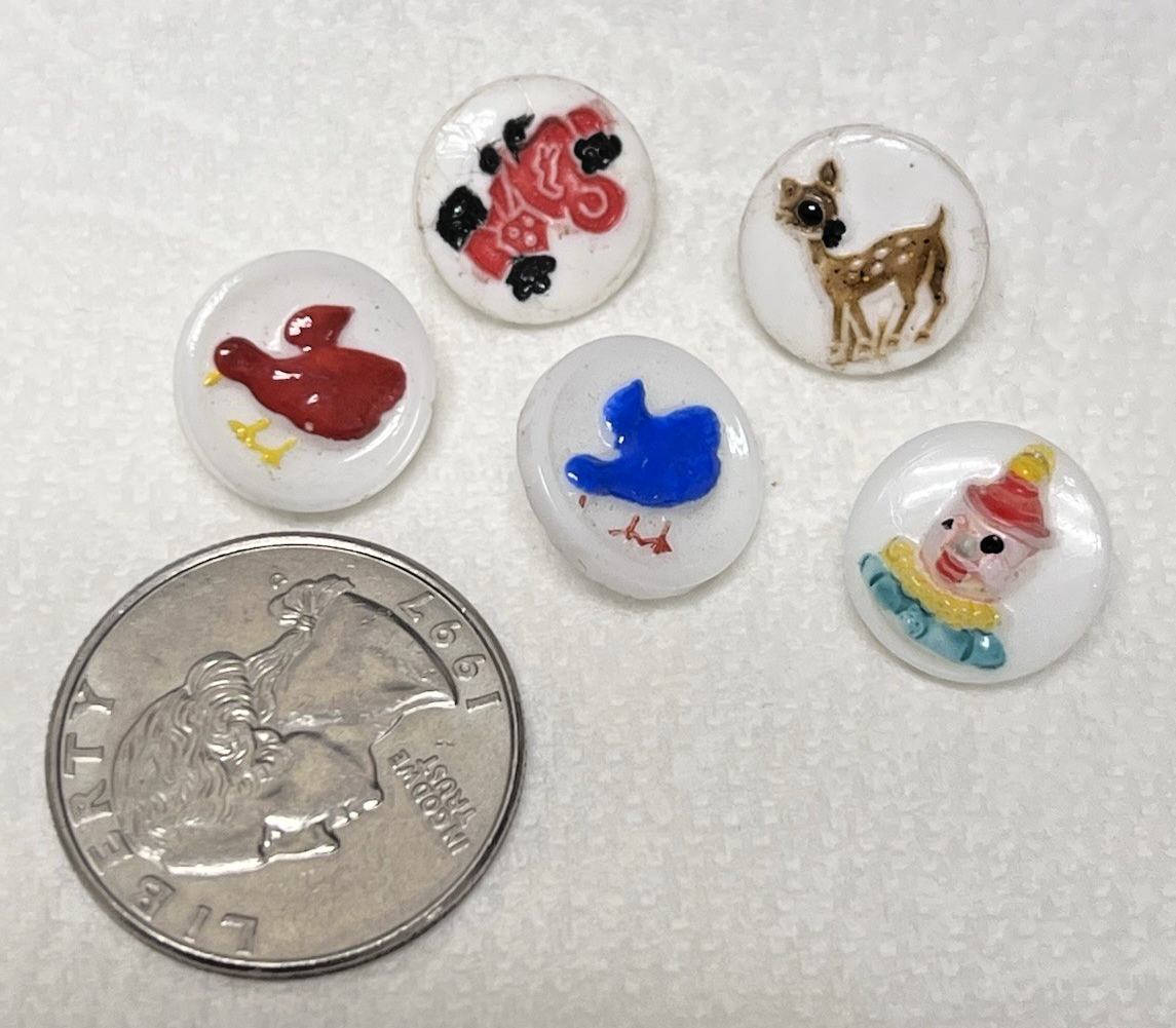 Vintage Milk Glass Buttons w Birds Deer Clown and a Bear ? Just over 1/2 "