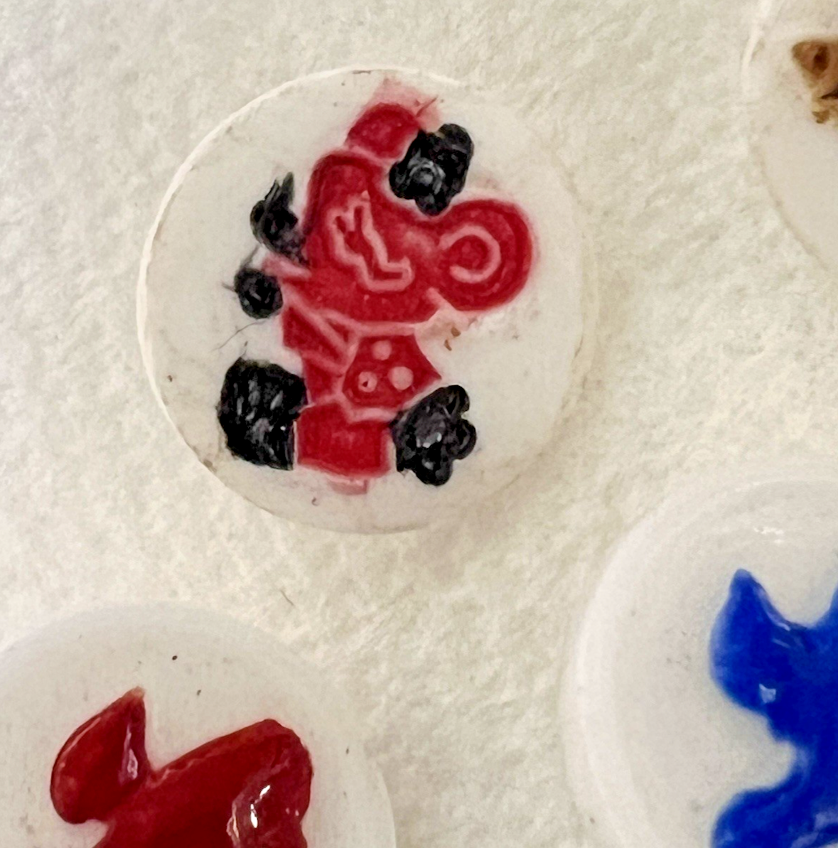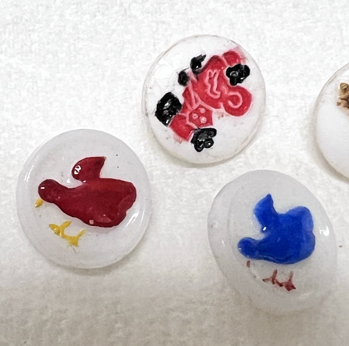 Vintage Milk Glass Buttons w Birds Deer Clown and a Bear ? Just over 1/2 " and some just about 1/2" ( we all looked at the red and black button but we think it's a bear sitting upright??) In very nice shape