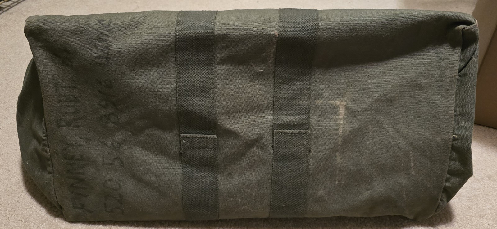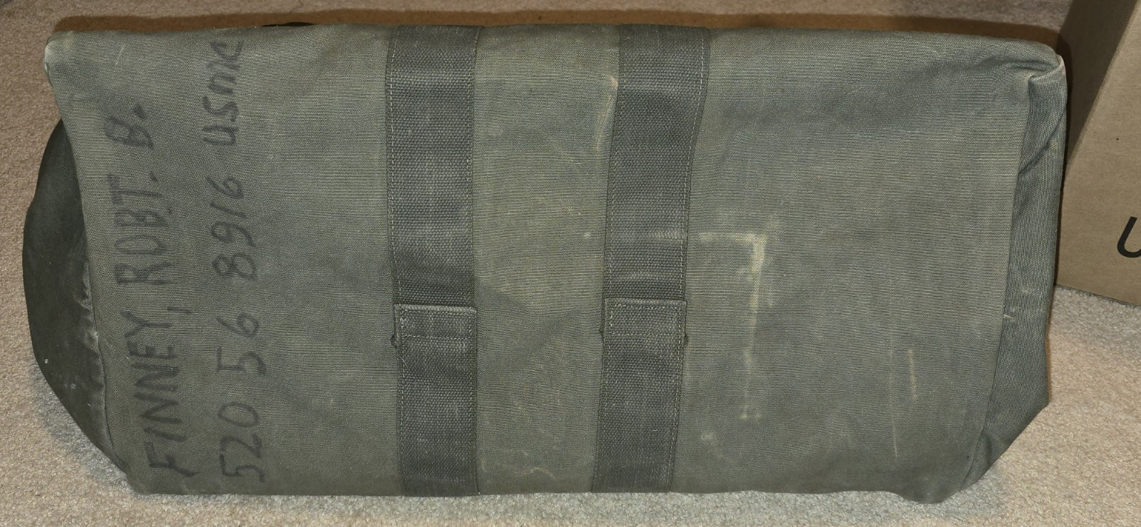 ***This bag has been well used over the last 50 years. The brass zipper works with no issues. All seven of the brass snap fasteners snap securely. The bag has a previous owner's name written on it (Finney, Robert B. USMC 520 56 8916). While it is well worn, it is fully functional.***
