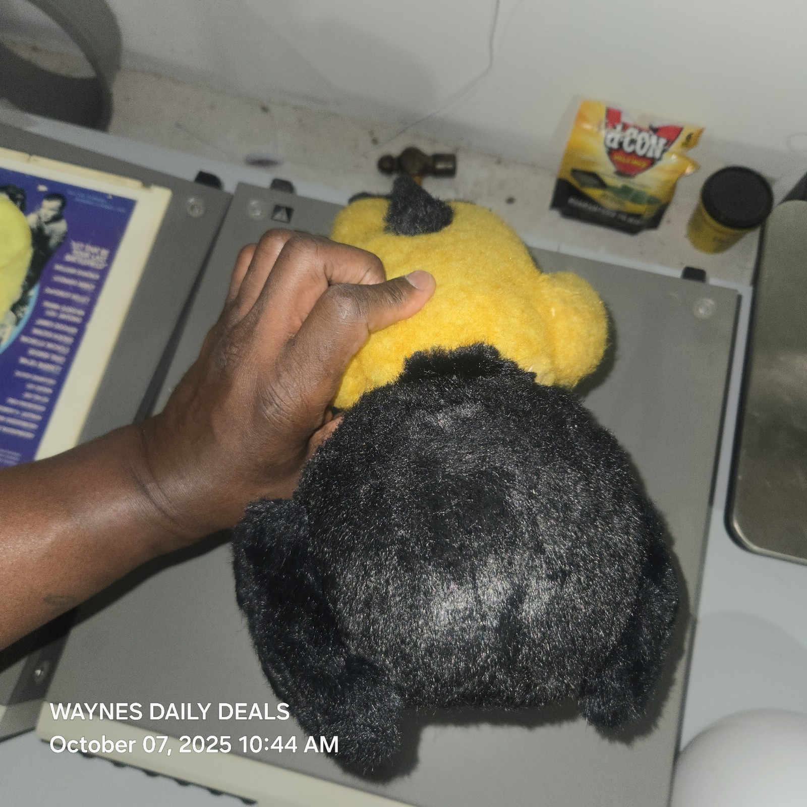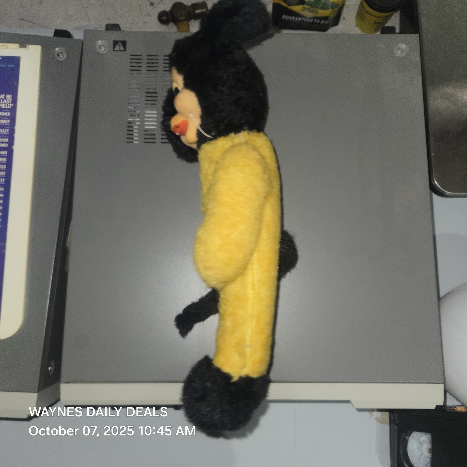 This doll features a rubber/vinyl molded face with bright eyes and rosy lips, a yellow fuzzy plush body, and black ears, feet, and tail. The style reflects the classic mid-century ?rubber face plush? era, making it a wonderful addition for collectors of retro toys, character memorabilia, or nursery decor.