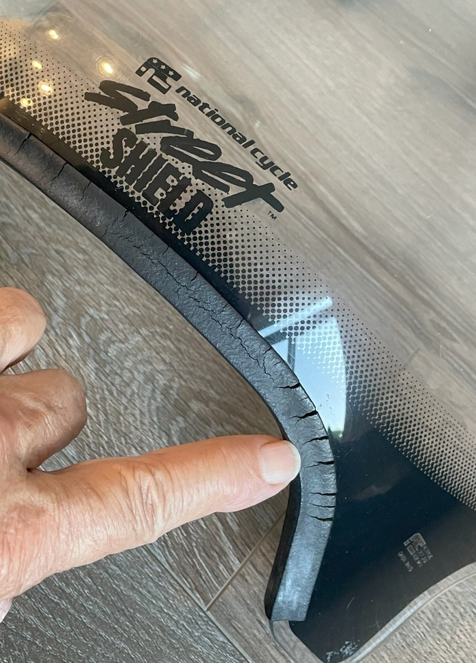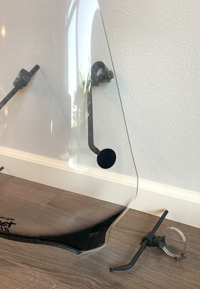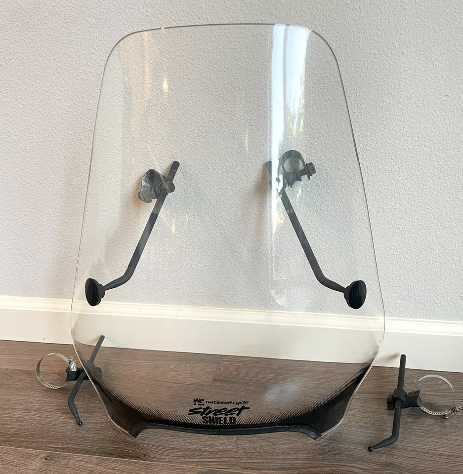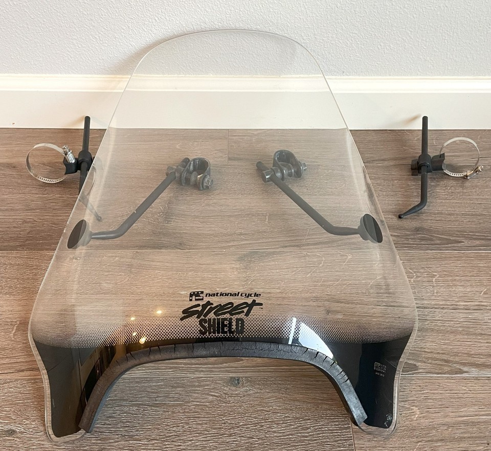 Up for sale is this National Cycle Street Shield Motorcycle Windshield With Mounting Hardware removed from 2008 Honda 750 Shadow Spirit with 1" Bars. The acrylic in nice condition, the rubber edging on the bottom shows some age deterioration and two edge grooves on the windshield, please see the photos. Hardware in good shape and the windshield attaches firmly.