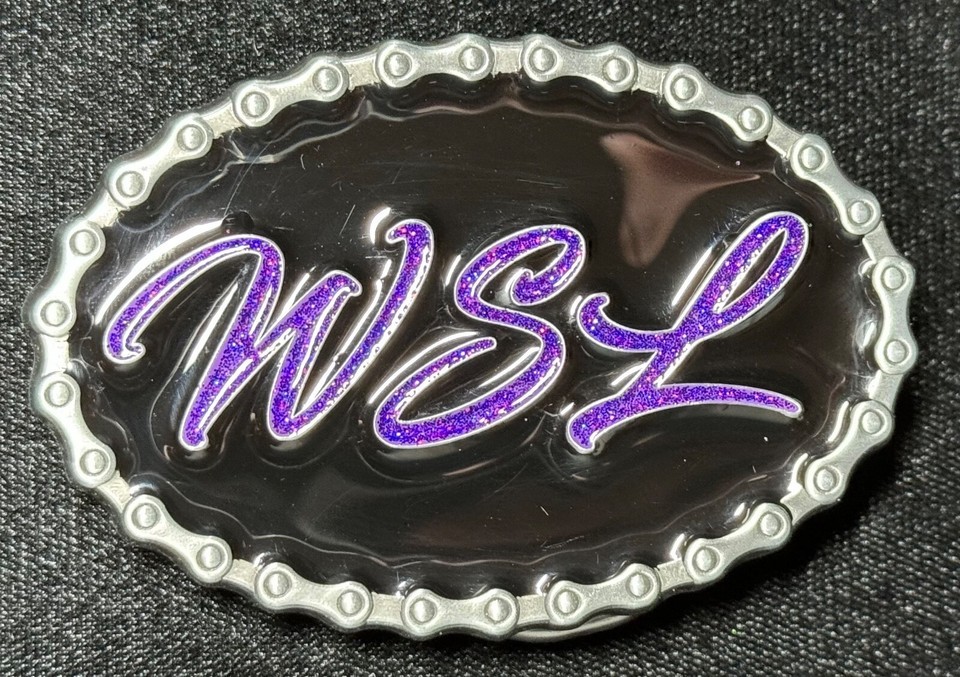 This is a 3" wide belt buckle for the Widows Sons Ladies with "WSL" in purple glitter over a black background, surrounded by bike chain.