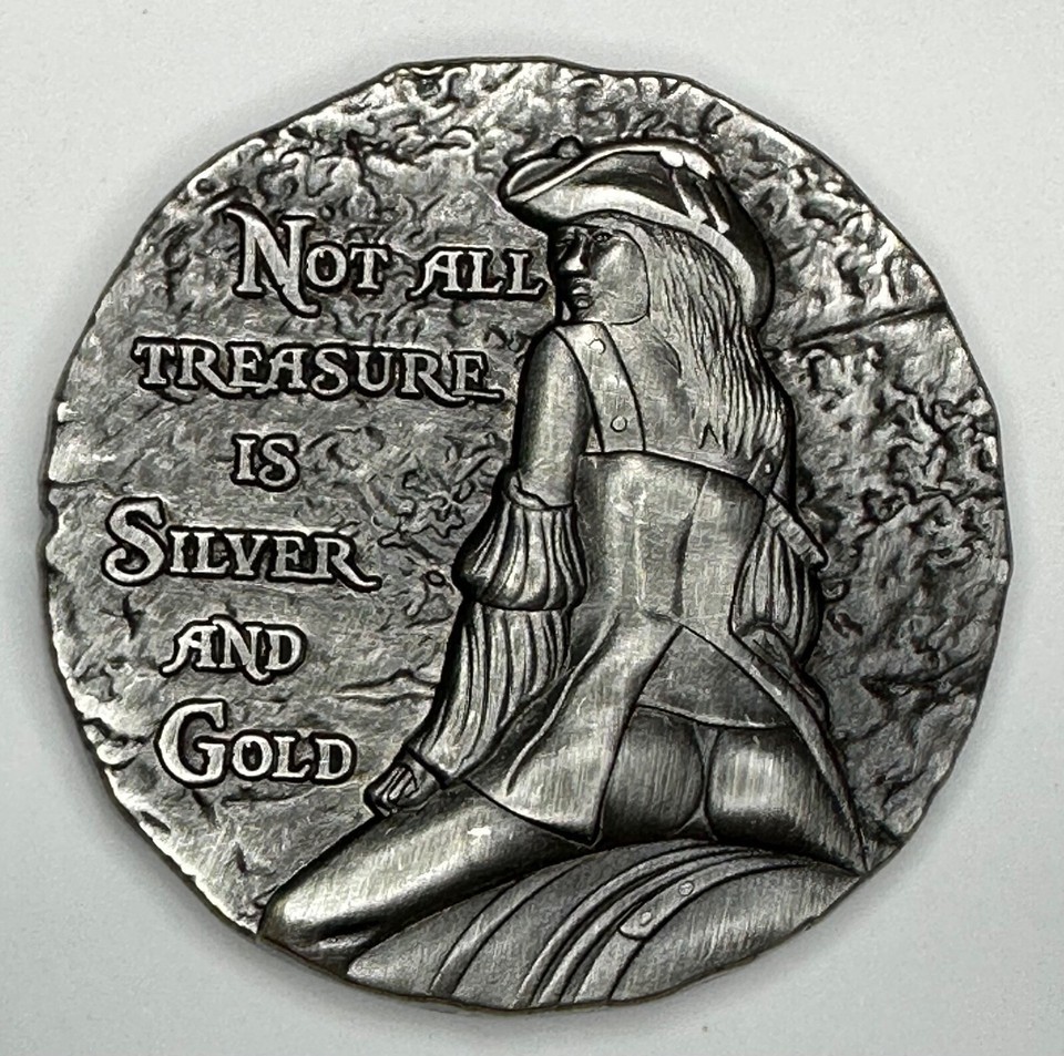 On the other side, there is a different kind of "Booty" and the phrase "Not all treasure is silver and gold," which we all know to be true because this particular prize has been sought for Millenia!