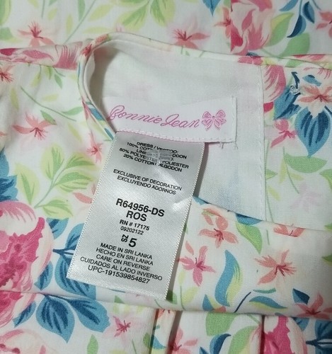 This beautiful Bonnie Jean girl's dress is a must-have for any little girl's wardrobe. With its short sleeves, smocked waistband, and embroidered flowers, it's the perfect dress for any occasion. Made from a comfortable cotton blend, this dress is both stylish and comfortable. The dress is a size 5 and features a lovely pink and blue multi-color design that is perfect for any little girl.