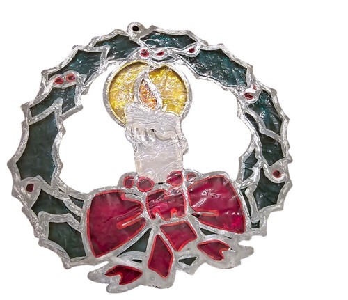 Beautiful vintage enamel metal Christmas wreath suncatcher, featuring candle, holly, and red bow details.