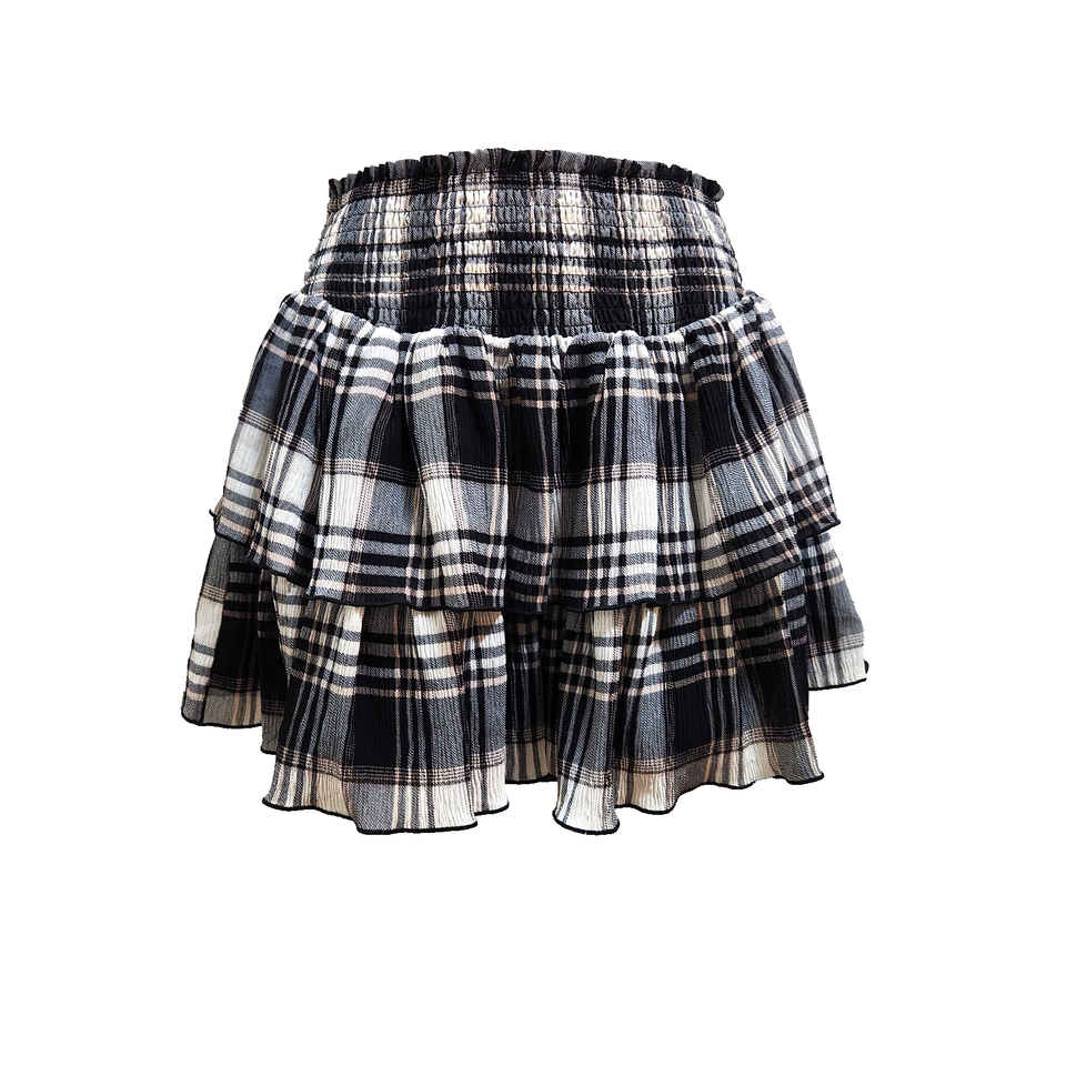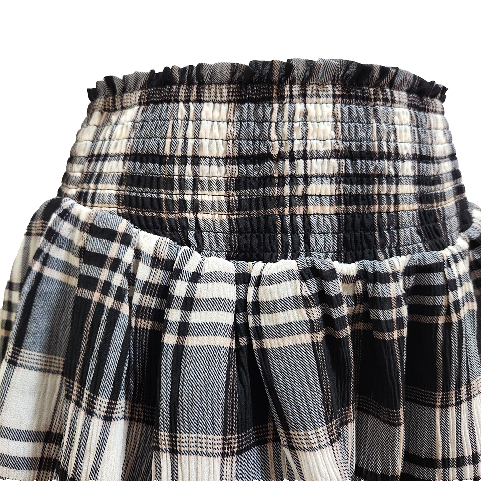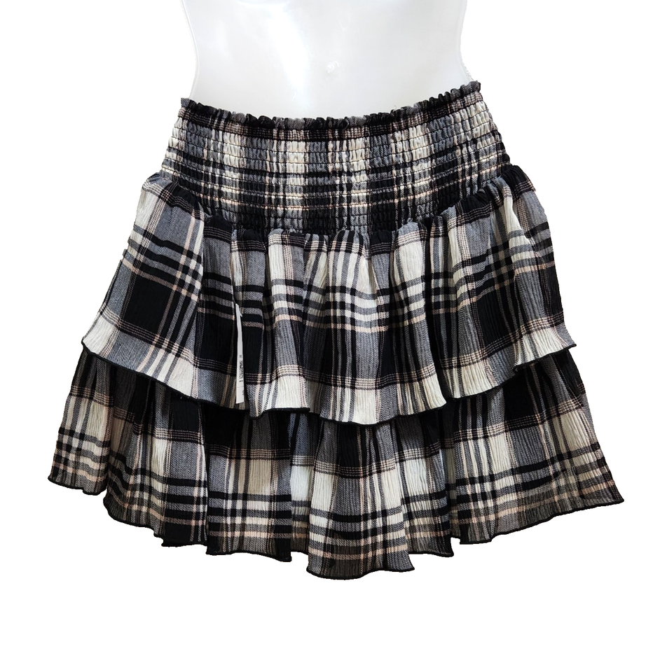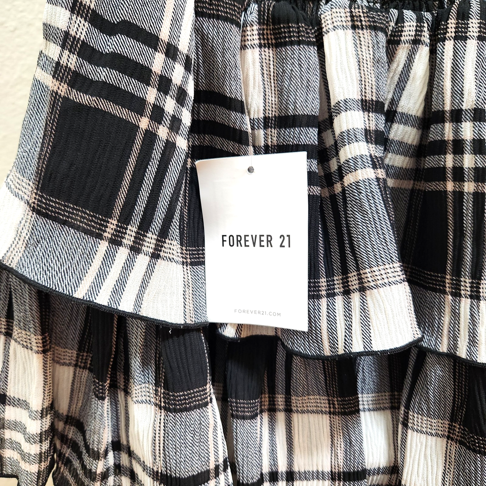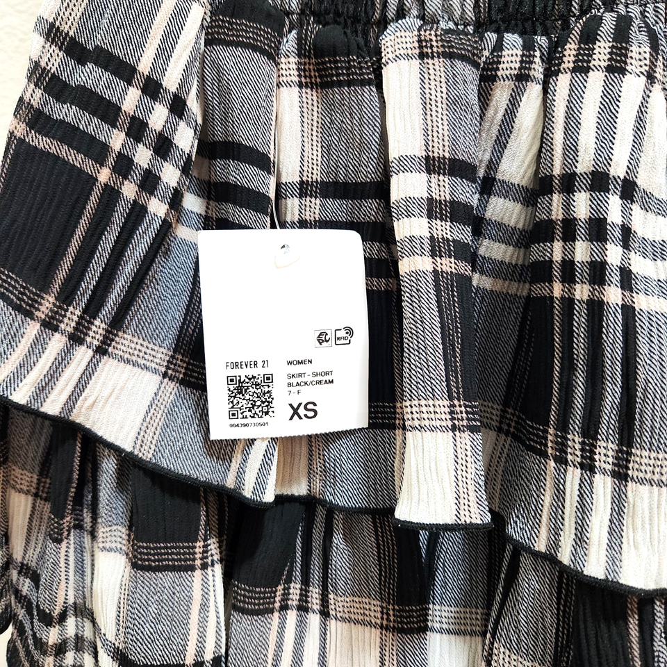 Forever 21 Skirt Plaid Tiered Ruffle Smocked Waist Size XS Black Cream Lined New