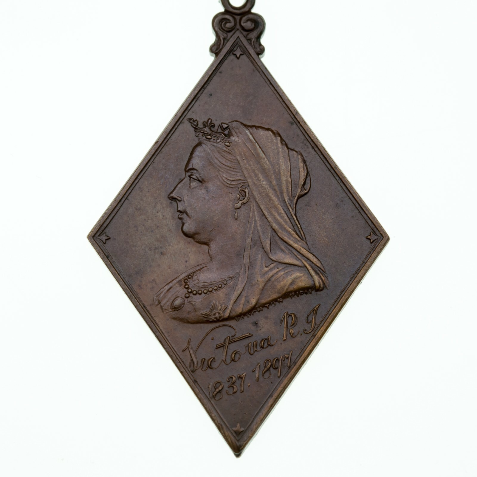 Medaille de bronze en forme de diamant ou pendentif de 2 "de longueur et 1 1/4" au point le plus large. Fabrique pour la fete des enfants de Glasgow commemorant le jubile de la reine Victoria en 1897. Le pendentif a la Crest de la ville de Glasgow d'un cote et une representation de la reine a d'autres