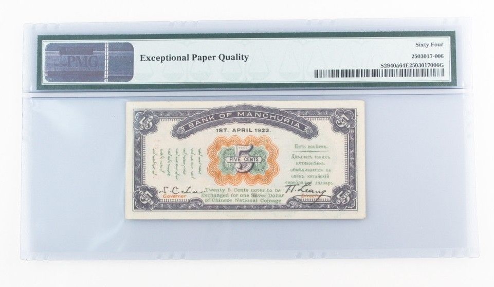Sellado en un soporte de PMG con la etiqueta "China, Banco de Manchuria // elige# S2940A S/M# T214-150A 1923 5 Cents // S/N 1072794 - Harbin"