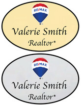 This listing is for 1 name badge or tag FOR RE/MAX. Your badges will arrive with a PIN fastener on the back of the badge. This badge IS OVAL SHAPED ONE IS METTALIC GOLD, METALLIC SILVER OR WHITE WITH A BLACK BEVELED EDGE AND MEASURES APPROX. 2" x 3". These badges are printed in full color with a clear overlay that protects the print for a durable long- lasting badge. YOUR BADGE WILL SHIP WITHIN 2 DAYS - FREE FIRST- CLASS MAIL, US ONLY. Leave your NAME TITLE EXACTLY how you want them printed, if you don't list a title NONE will be printed. Also list the color you prefer.