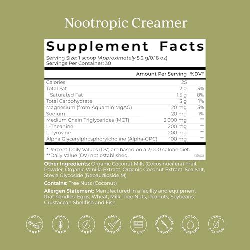 Bullet point: NOOTROPIC CREAMER: A brain-boosting, plant-based coffee creamer designed to support focus, memory, and mental clarity. Formulated with key nootropics like Alpha GPC, L-Theanine, and L-Tyrosine to help elevate cognitive performance and support a calm yet alert state of mind, without the crash.