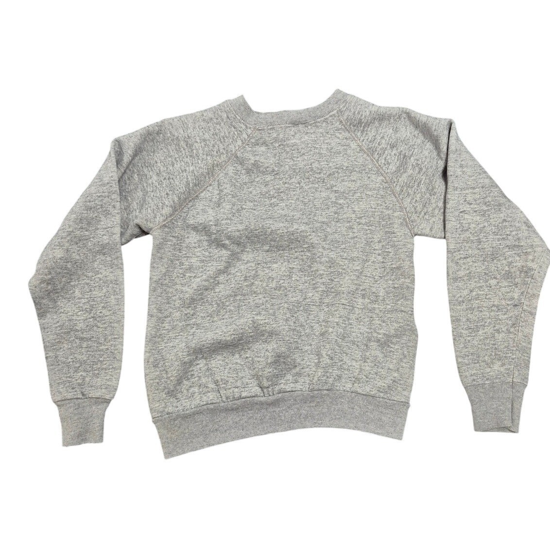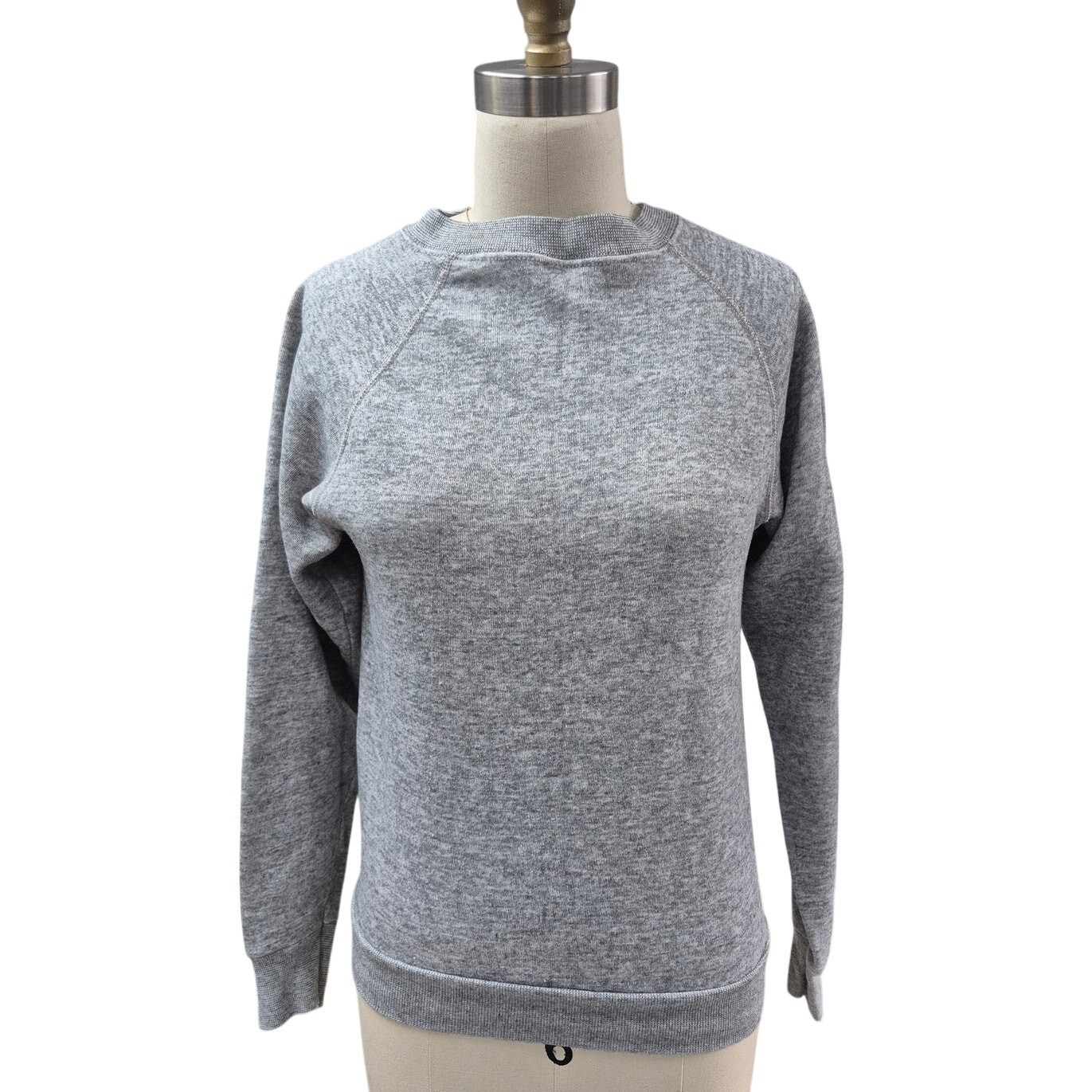 1960s?1970s vintage small heather gray sweatshirt in a cotton blend with fleecy backing, featuring raglan sleeves, elastic waistband, and 3" ribbed cuffs. Classic mid-century athletic wear in a versatile neutral tone.