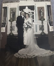 The product is a 1947 wedding couple portrait featuring a bride and groom in a Catholic church. The photograph captures a sentimental moment in time from the 1940s, showcasing a classic and timeless theme of love and marriage. With its vibrant color and original production, this piece of photographic history offers a glimpse into the past and preserves the beauty of a special day for a couple.