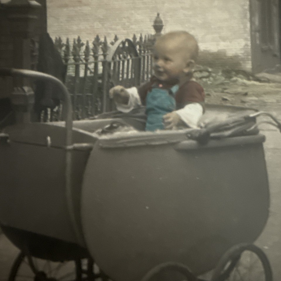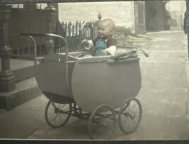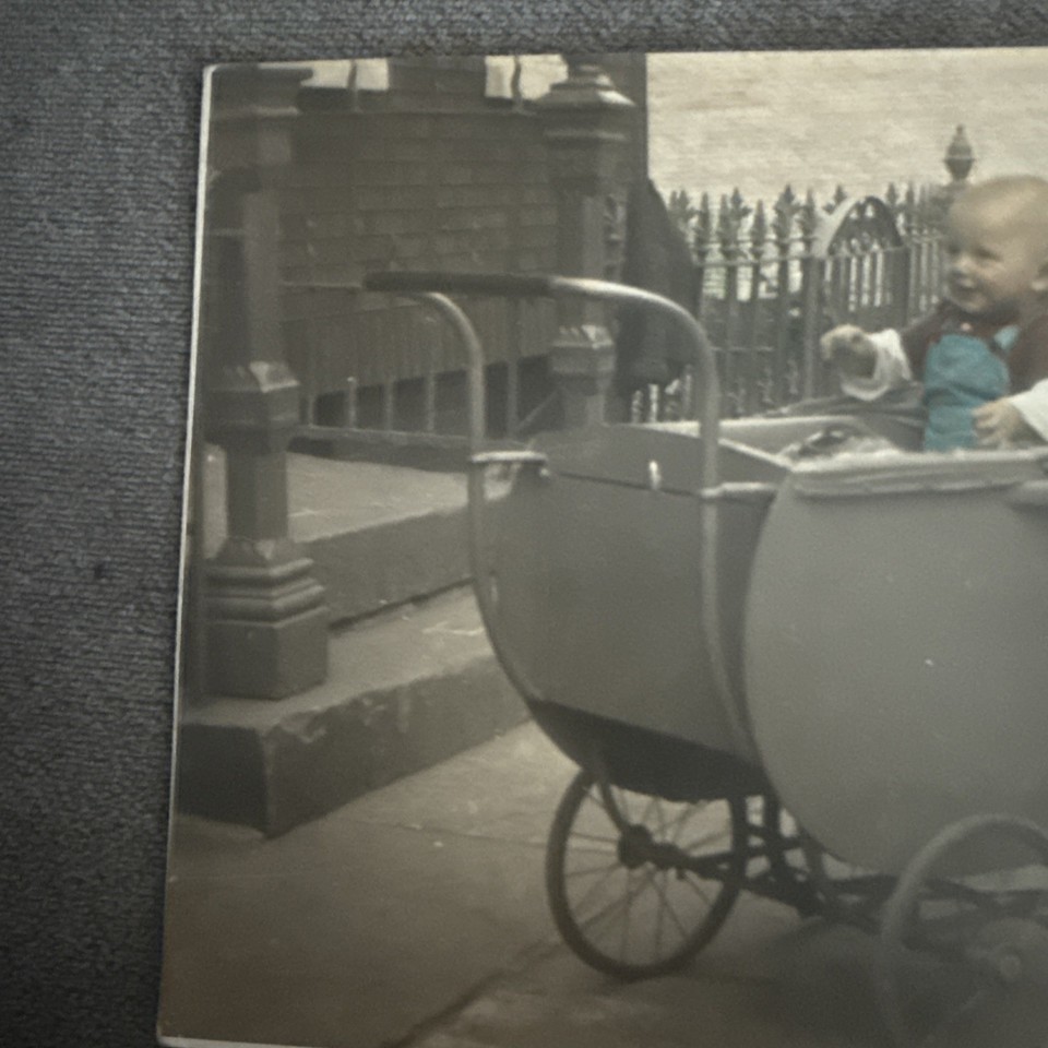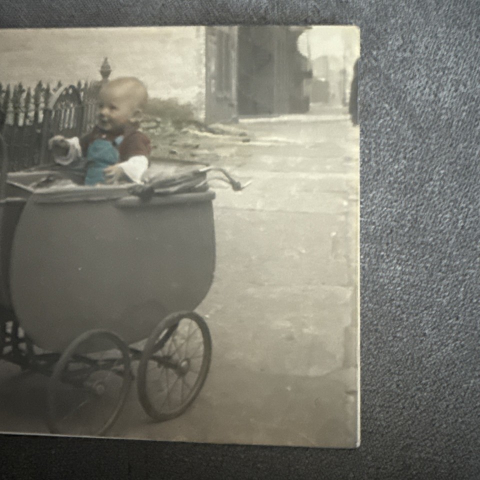 Vintage Antique Photo of Cute Little Baby Boy In Stroller Color Hand Tint City