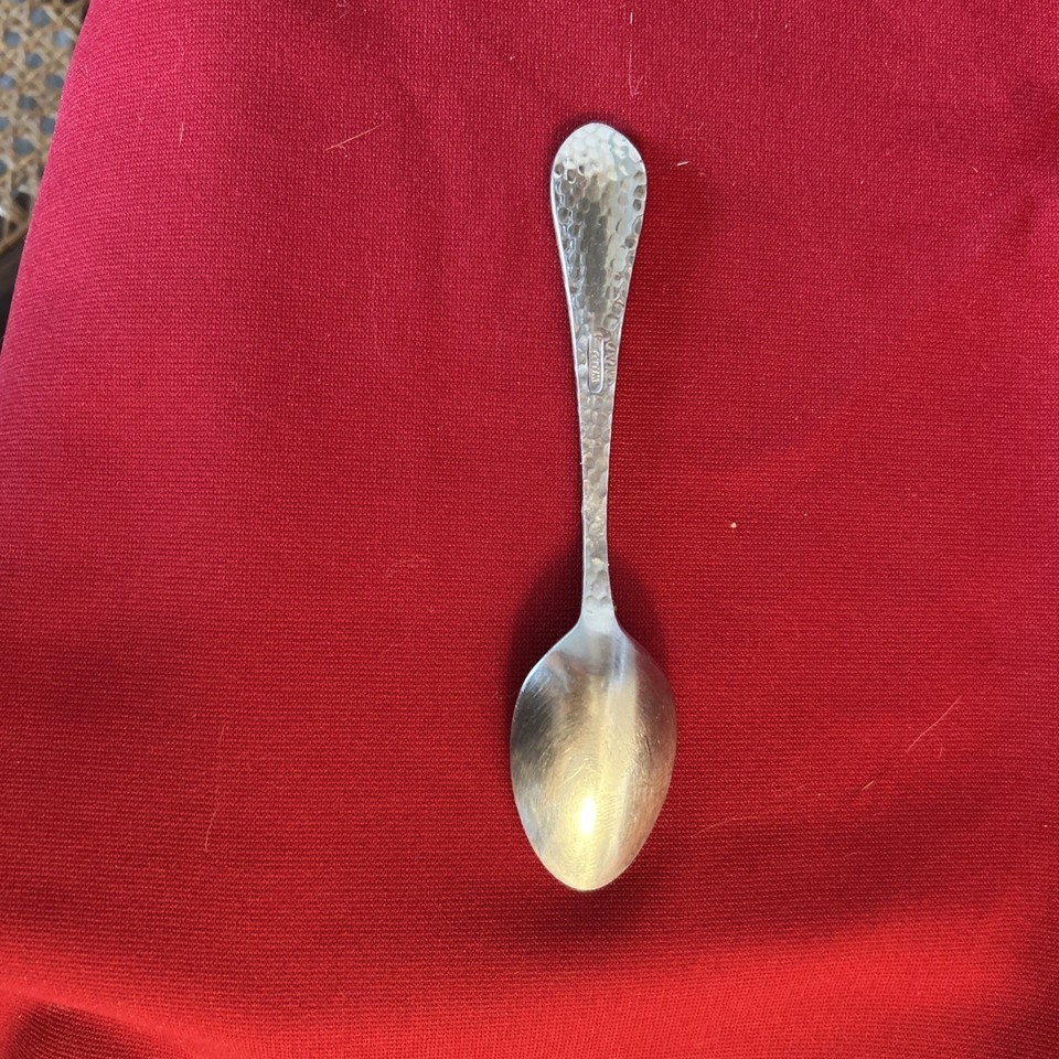 The product is a vintage Walco ironstone spoon made of stainless steel, with a length of 6 1/8 inches. The spoon has a hammered finish and a silver color, making it a unique and collectible piece for any kitchen or dining set. It is a single flatware item that can be added to a collection of kitchen and home decor items. The spoon is in its original form and is suitable for adults who appreciate vintage kitchenware.