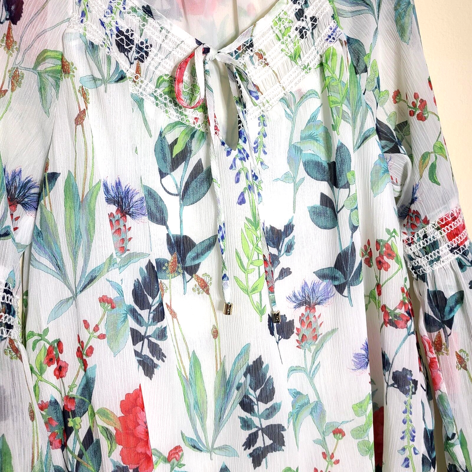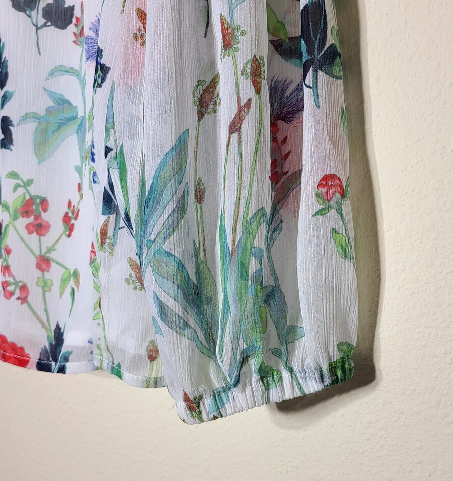 Style: Blouse, Pullover, Tie Closure, Smocking on Front Neckline, Smocking on Sleeves, Long Sheer Sleeves, Sheer Shoulders, Lined Front Back Bodice, Floral Crinkle Chiffon, Botanical