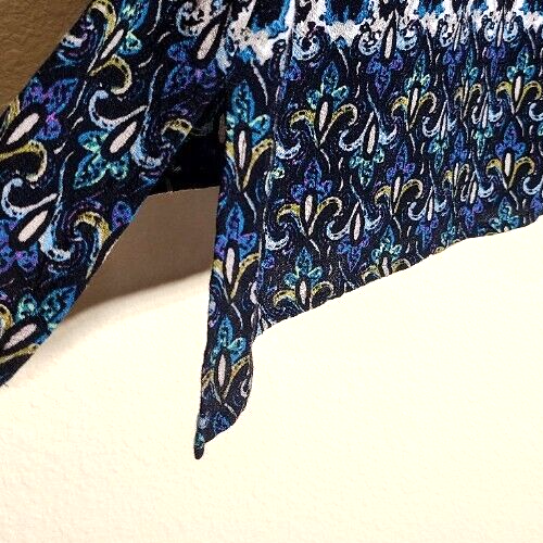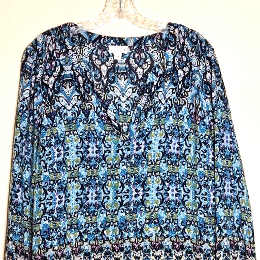 J Jill Top Size L Blue Black Mixed Print Split Neck Tunic Long Sleeve Side Slits