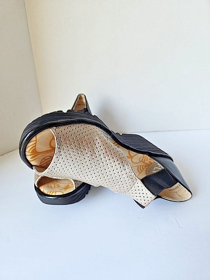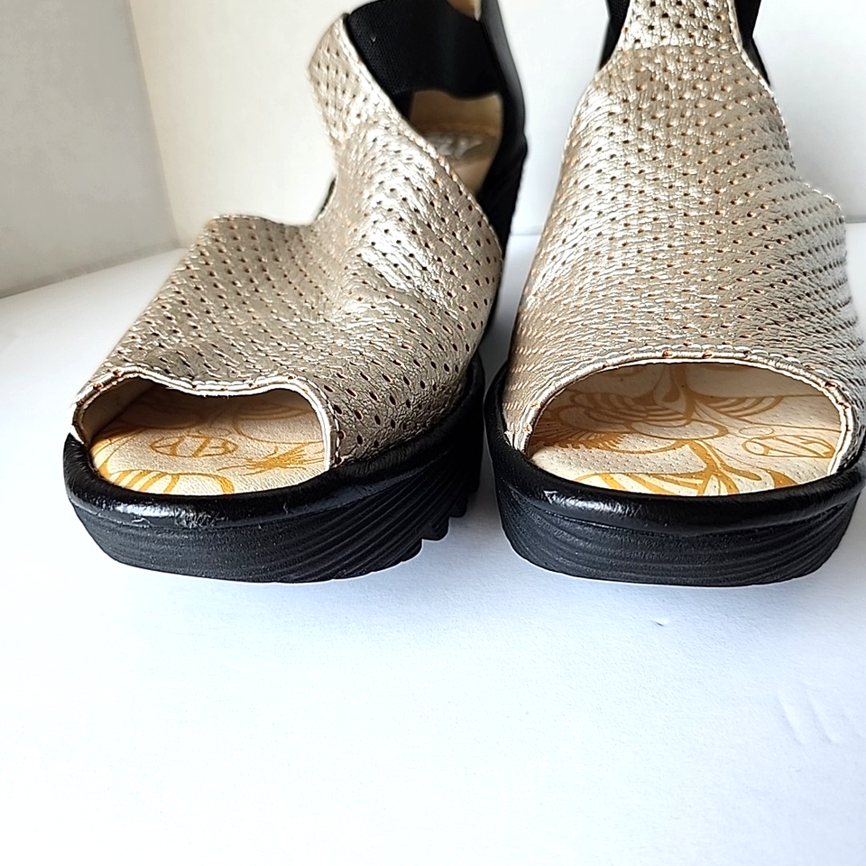 Fly London Peep Toe Shoes Womens EU 38 US 7.5 - 8 Wedge Gold Perforated Black