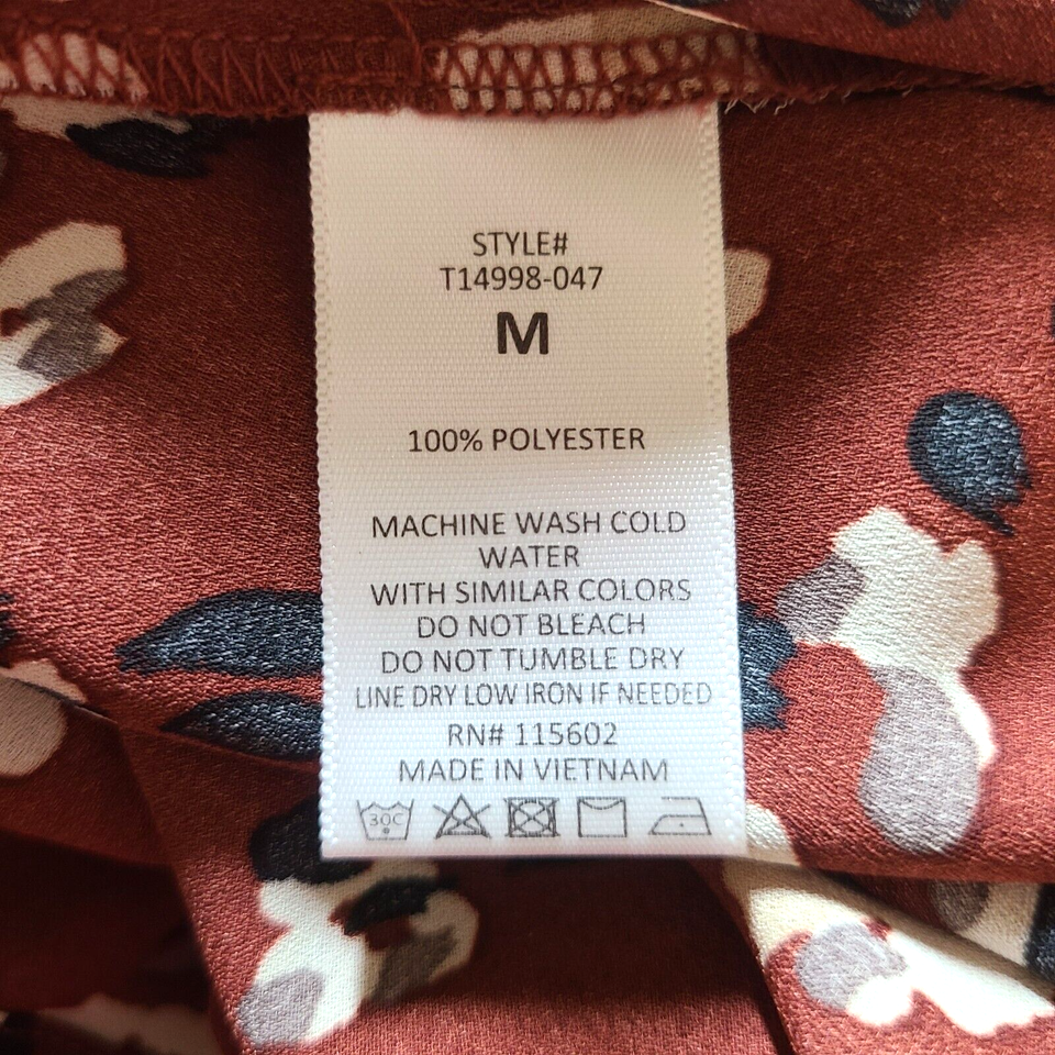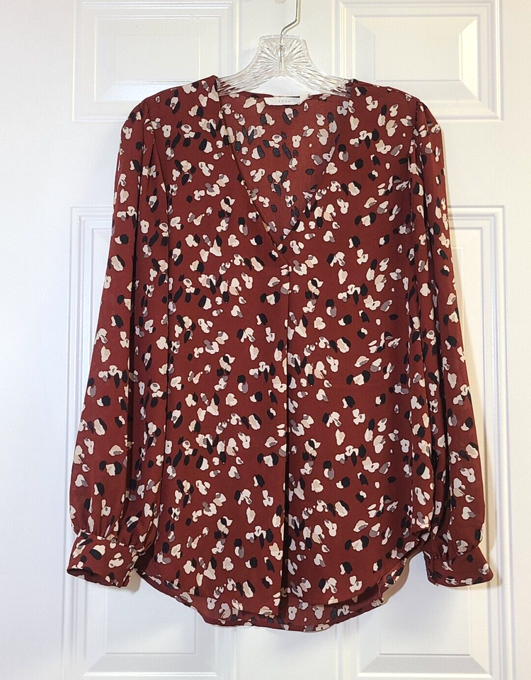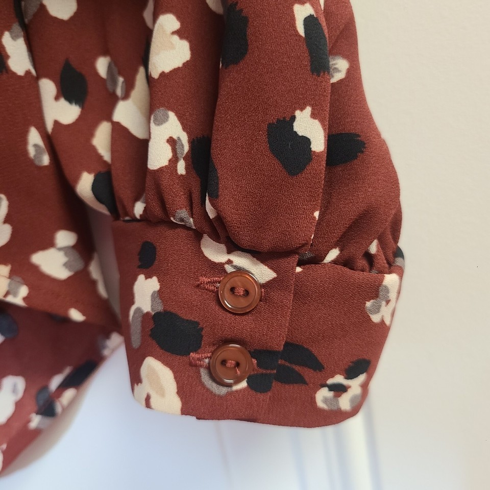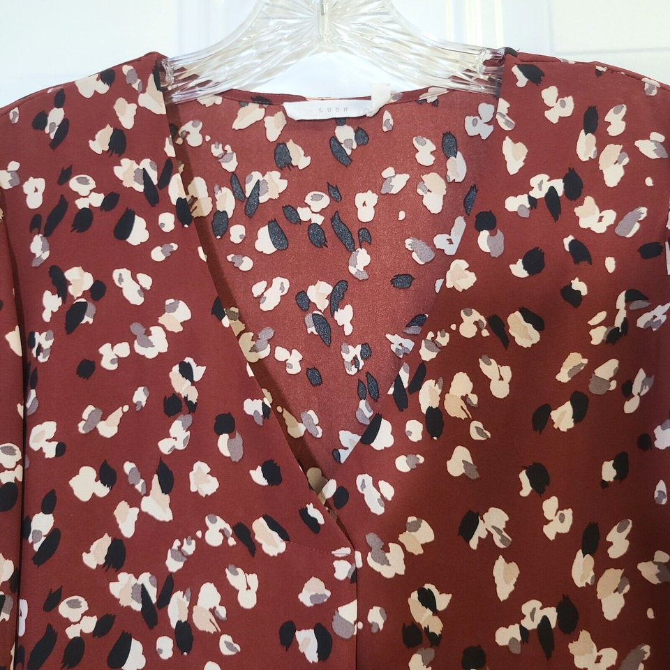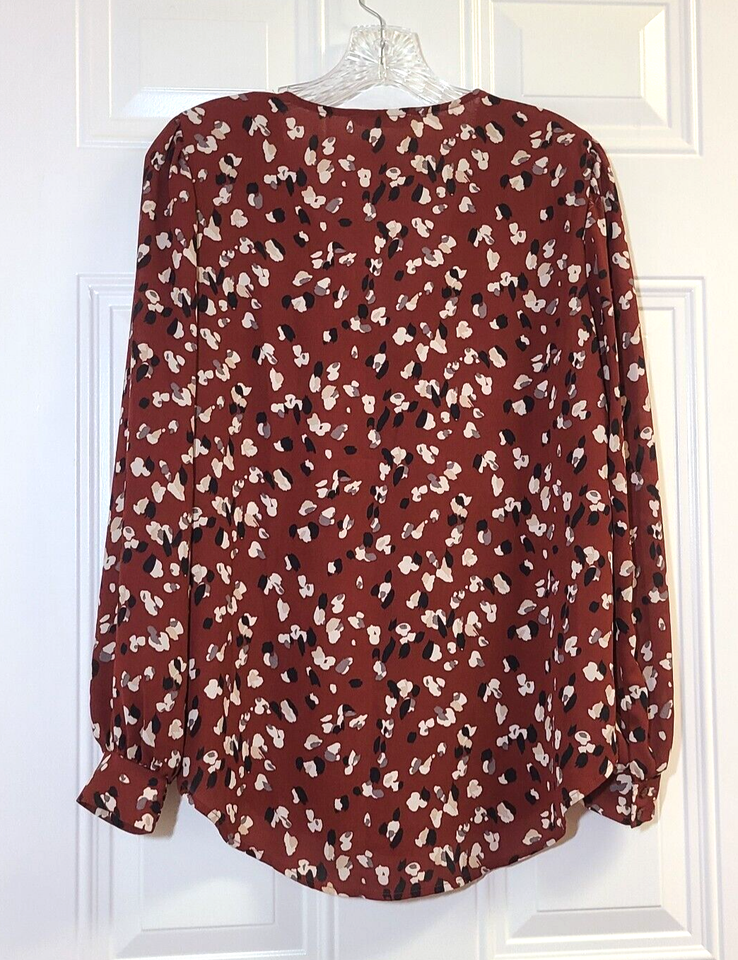 Lush Chantelli Top Brown Size M Blouse Long Sleeve V-Neck Pleat Print Semi Sheer