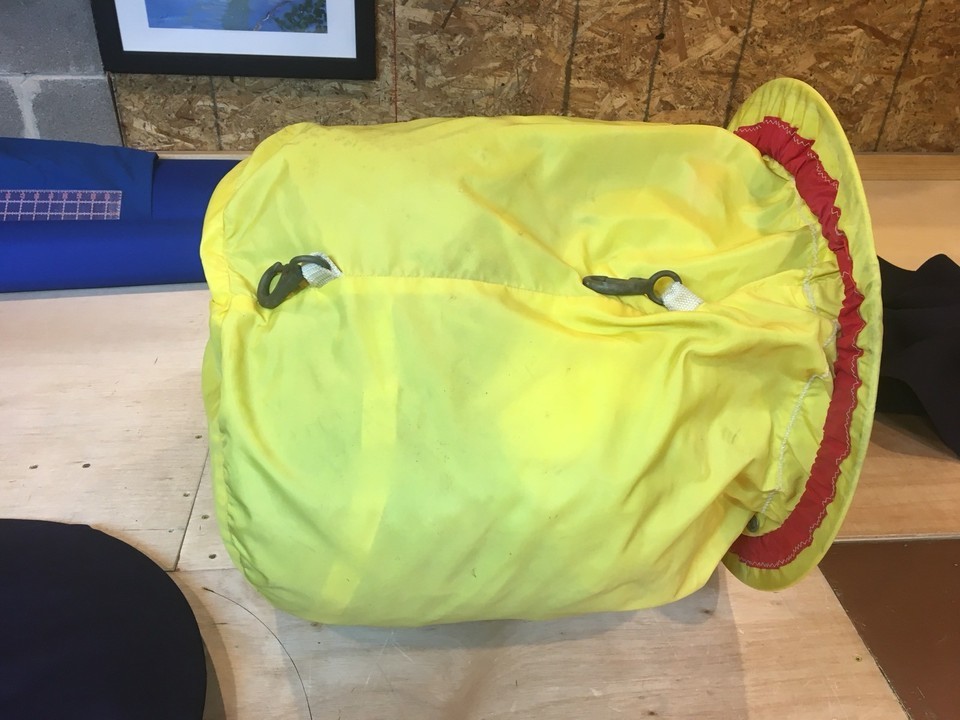 This is a very large spinnaker/Genacker Launch Bag. A 24 inch stainless ring is sewn into the top of the bag and a bungee cover has been added to close the bag and protect the sail. Tabs with fasteners are provided at the top and bottom of the bag to secure it to the deck.Stuff your sail in the bag with halyard and sheets leading out of the mouth of the bag, close the bungee lid and secure the bag to the deck. When you are ready to launch your sail pull the halyard and the lid will open allowing your sail to deploy.