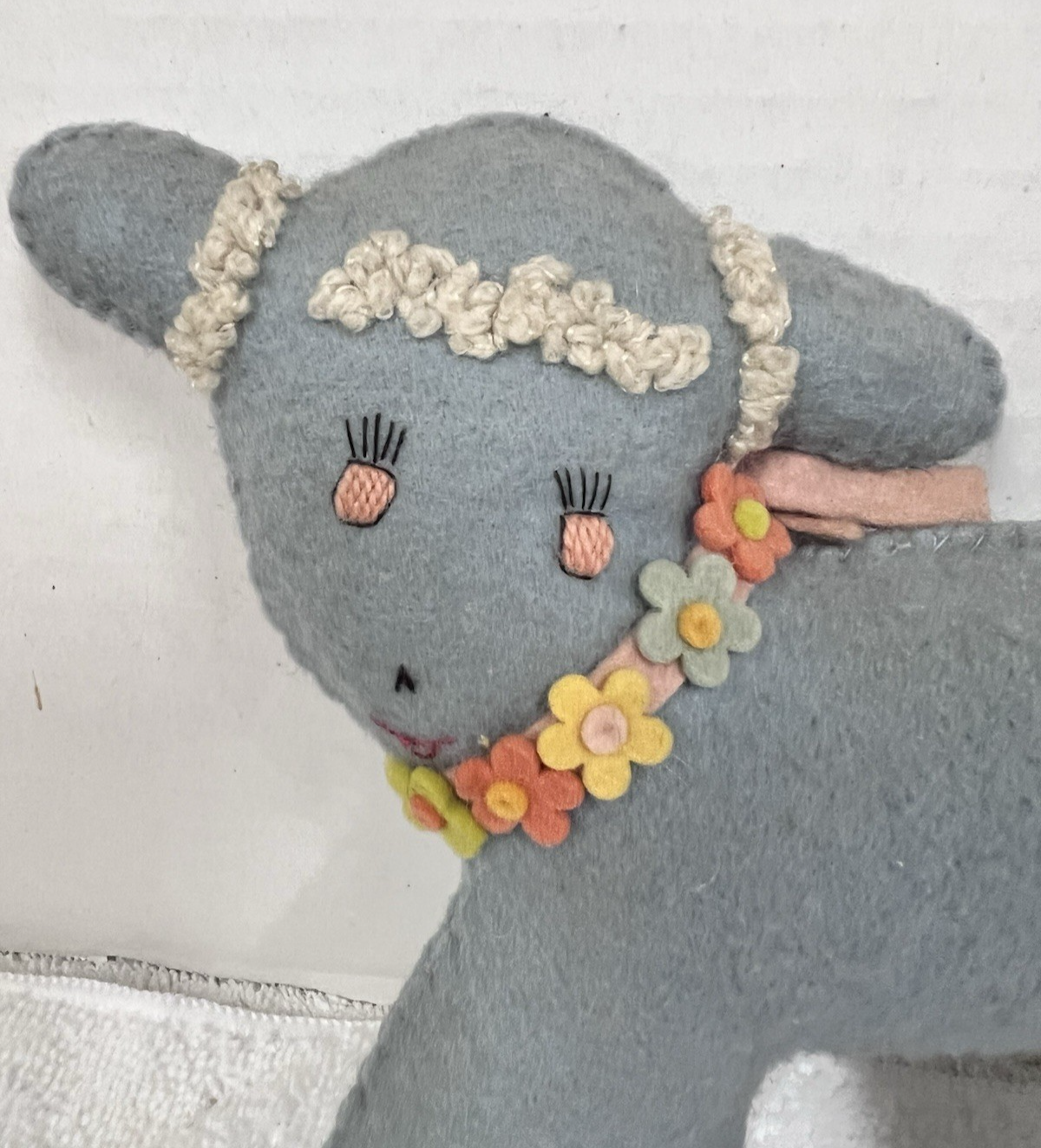 Handmade Blue Felt Lamb Sheep w Flower Garland Necklace 8 1/4 x 7 1/4 In good shape however we used a flash, so it looks lighter in color than it is its several shades darker blue