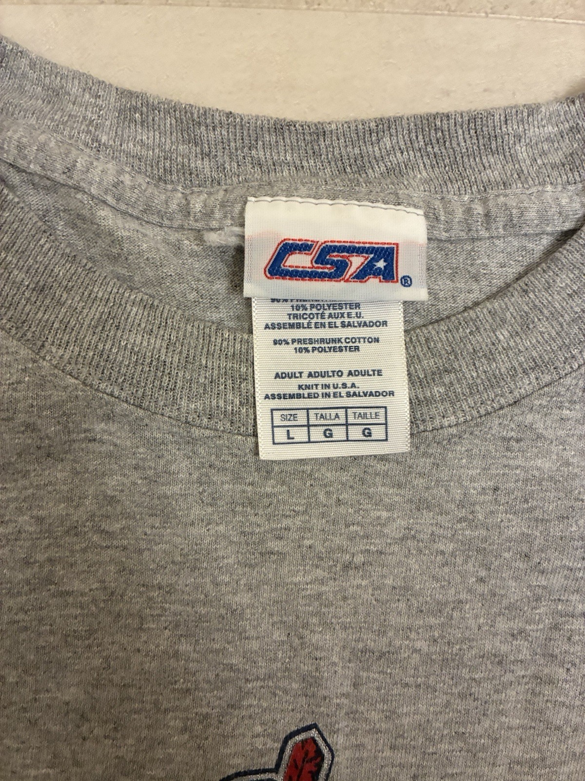 This tee is 90% preshrunk cotton and 10% polyester. Adult size large. Good preowned condition.