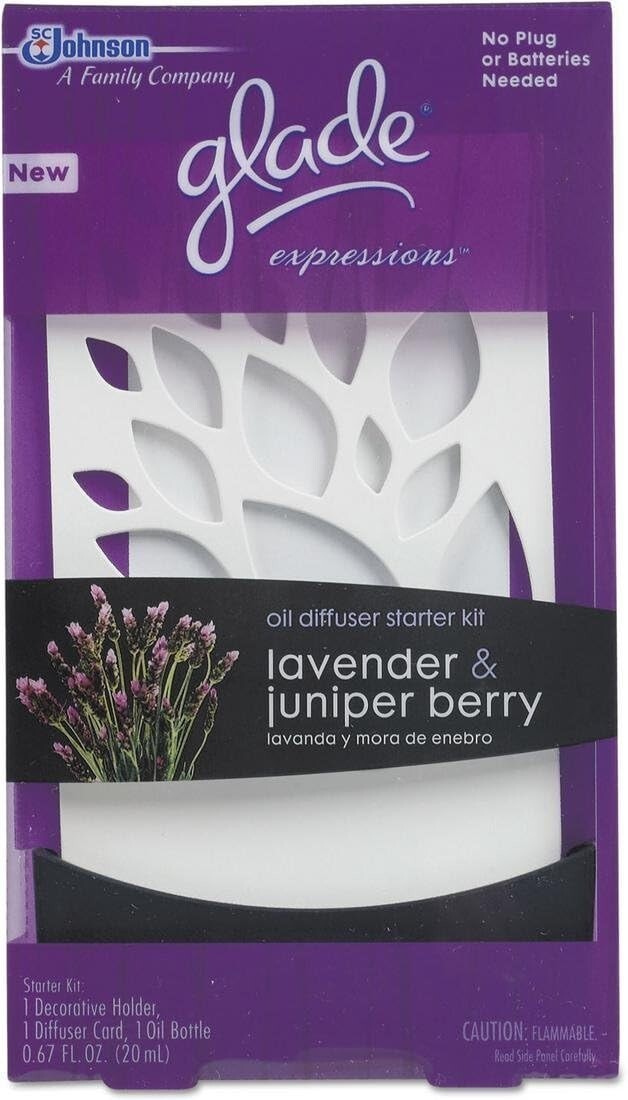 Glade Expressions Oil Diffuser Starter Kit with holder, oil bottle, and Lavender and Juniper Berry diffuser card.