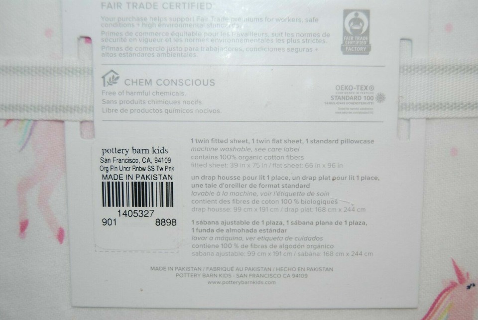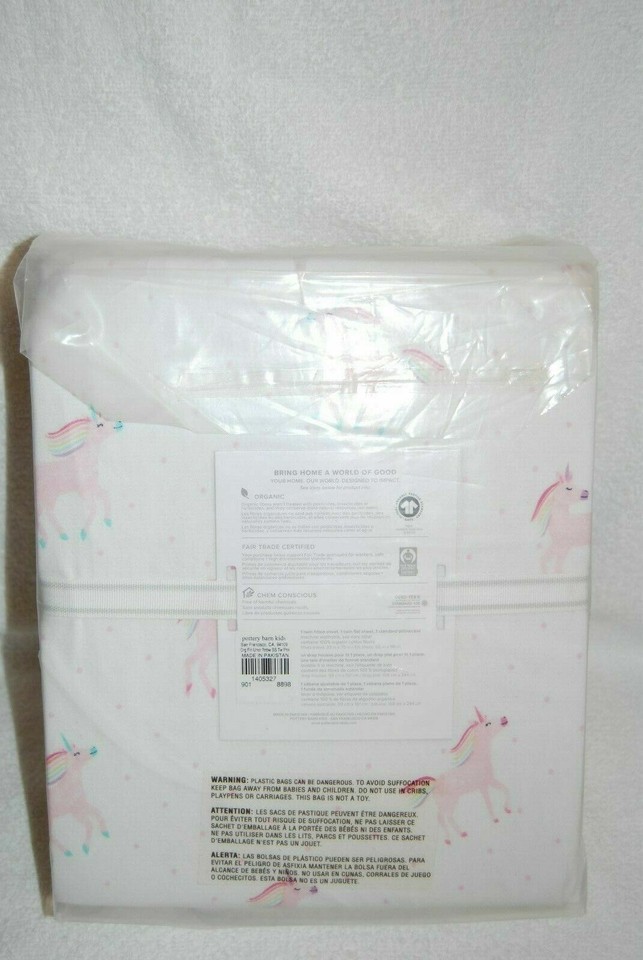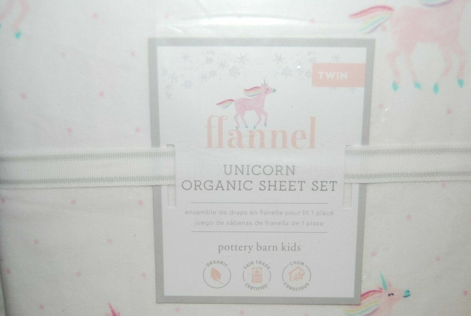 NEW Pottery barn kids Organic Flannel Rainbow Unicorn TWIN Sheet set Pink Horse