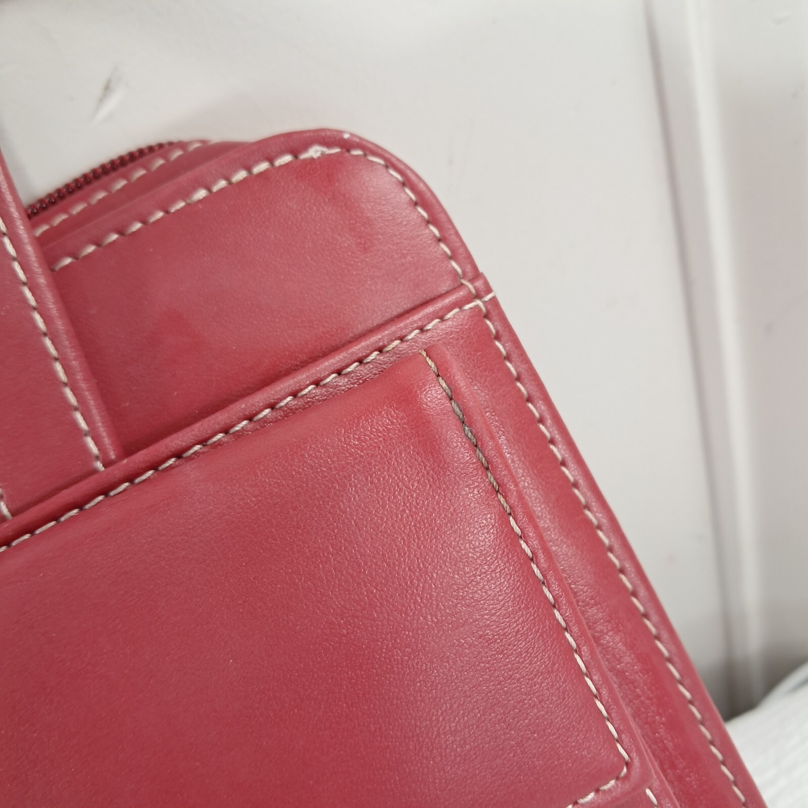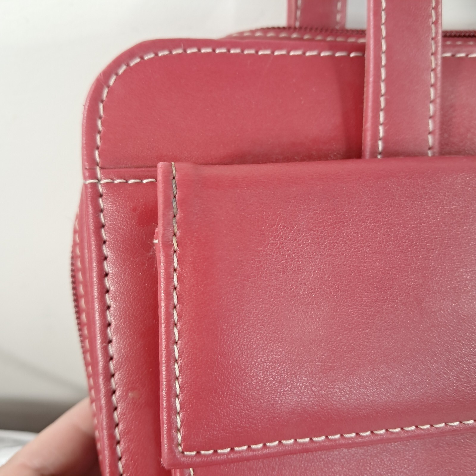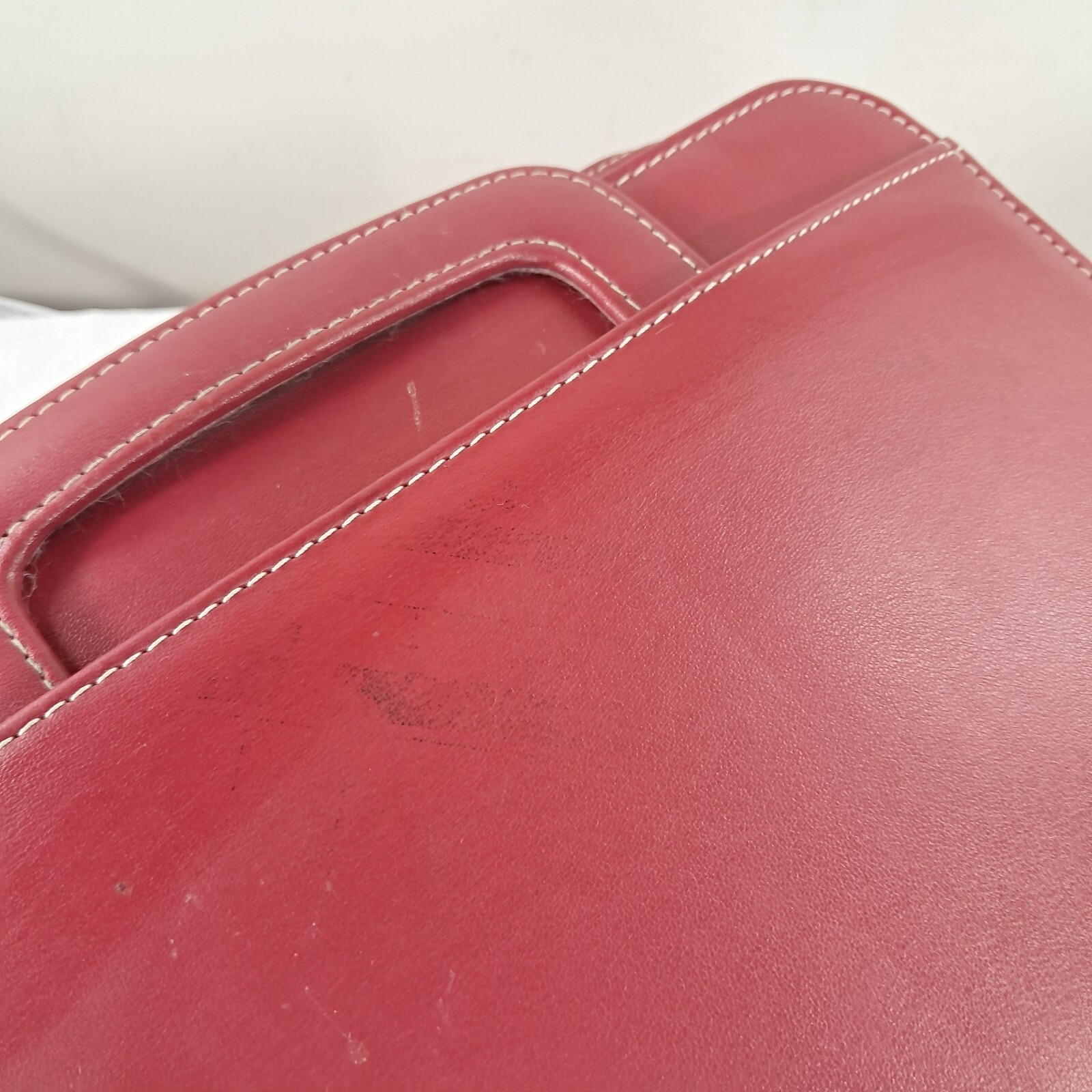 Red faux leather with retractable handles. Includes various inserts as shown. The clear zip pouch on the inside front has some ink transfer as shown. Some wear/marks/dirt wear as shown. Overall good to very good condition.