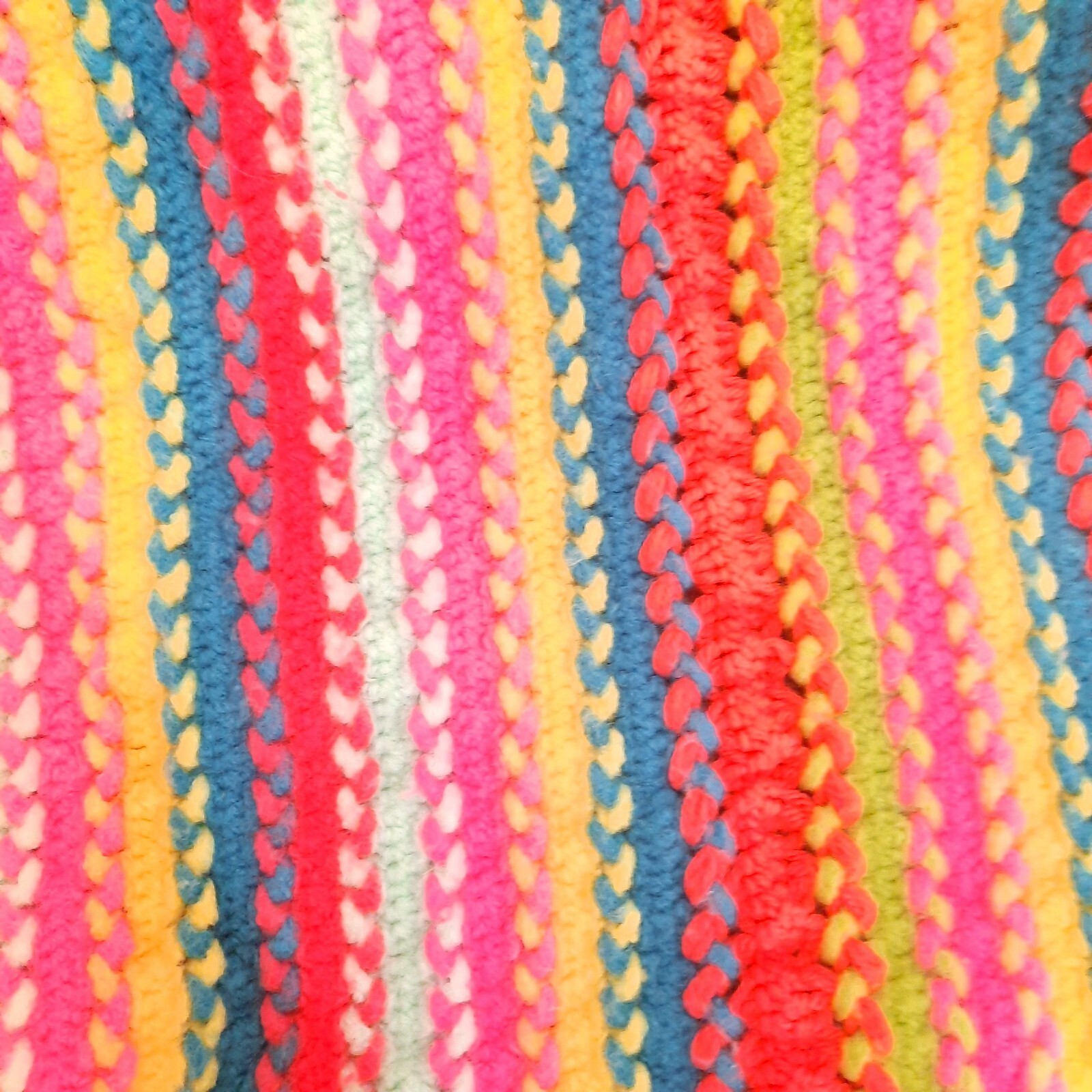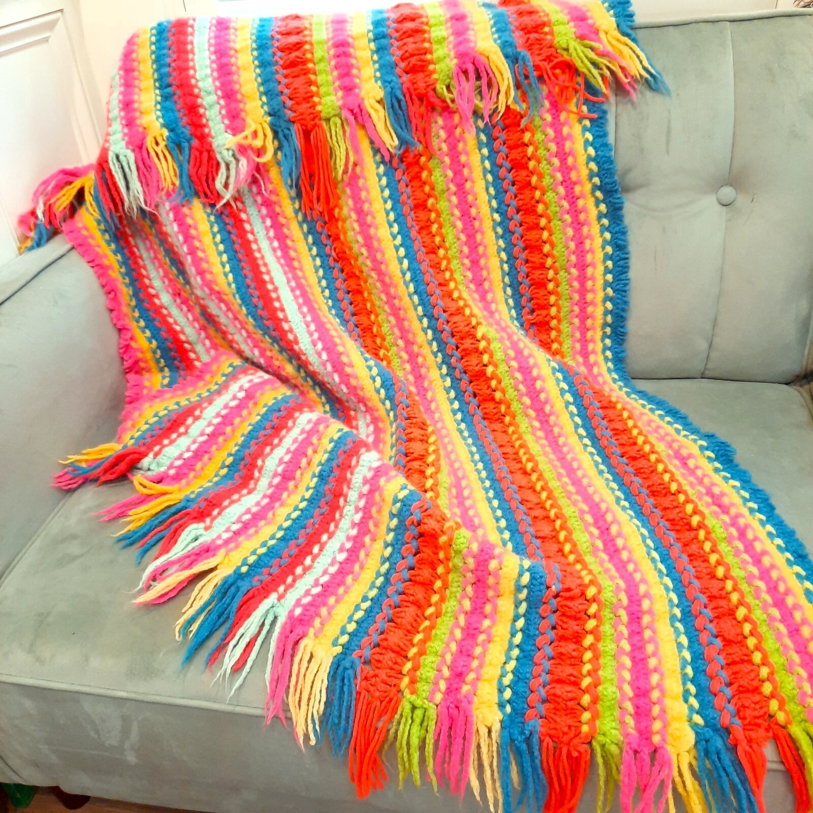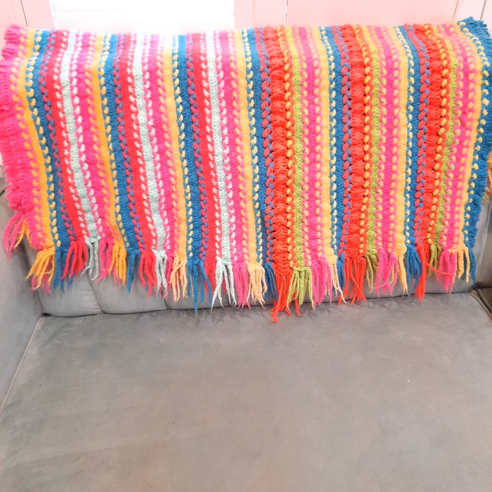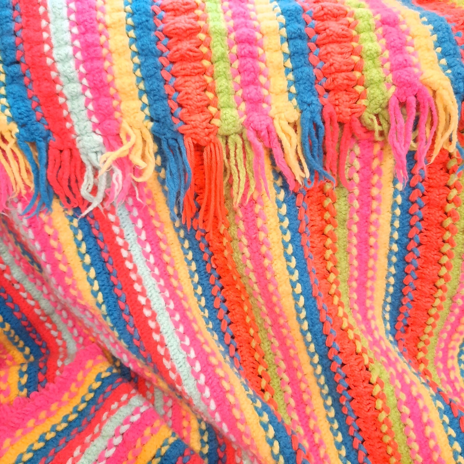 Handmade Neon afghan lap throw blanket rainbow stripes bright colors fringe