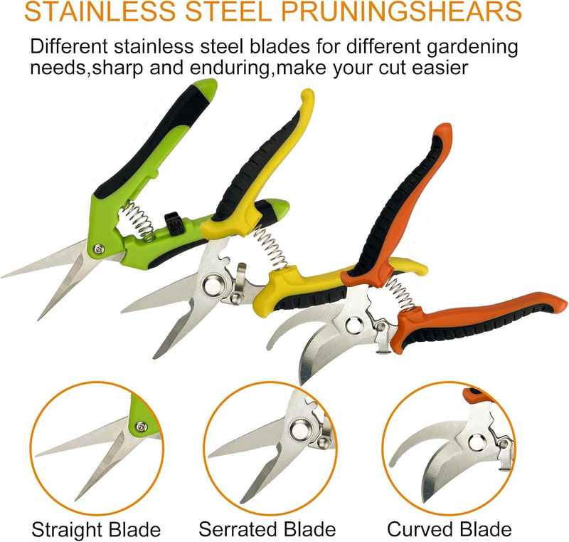 Pruning shears for gardening include 3 different blades and gloves for a variety of general pruning work. Great for trimming flowers, plants, bonsai, hydroponics, herbs, light branches and so on. Shears gardening tools are ideal for pruning needs and perfect gift for gardening friends
