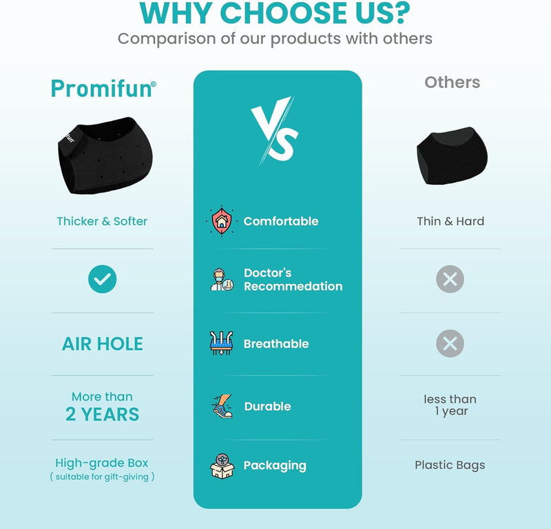 Soft and Comfortable Cushioning - Promifun heel pads distribute pressure evenly for superior shock absorption and comfort, making them perfect for those who spend long hours on their feet.Compared to pure silicone heel covers, this protector is more breathable and it doesn't easily wear down