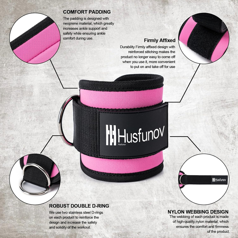 MULTIPURPOSE GYM EXERCISE ROUTINES: Husfunov ankle straps for bands provide superior ankle support for your legs booty work out. Of essential gym accessories for cable pulley kickbacks, hip swings, side leg lifts, donkey kicks, leg curls, hip thrust, cross over leg extensions, hip abductor, glute, hamstrings and quad workouts.