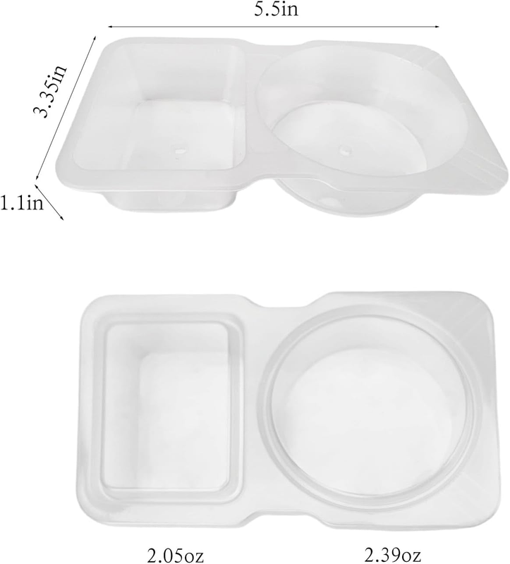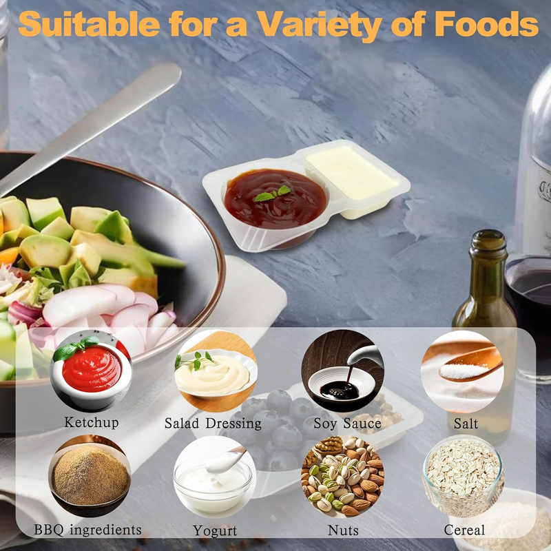 ?2-in-1 Dual Compartment Design? Store sauces, dips or spices separately in two leak-proof sections (50 ml each). No need to worry about mixing flavors, keep the condiments original. Such as ketchup and mustard, soy sauce and chili oil, yogurt and granola.