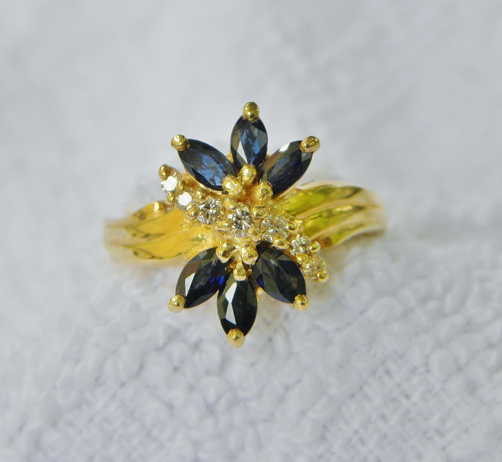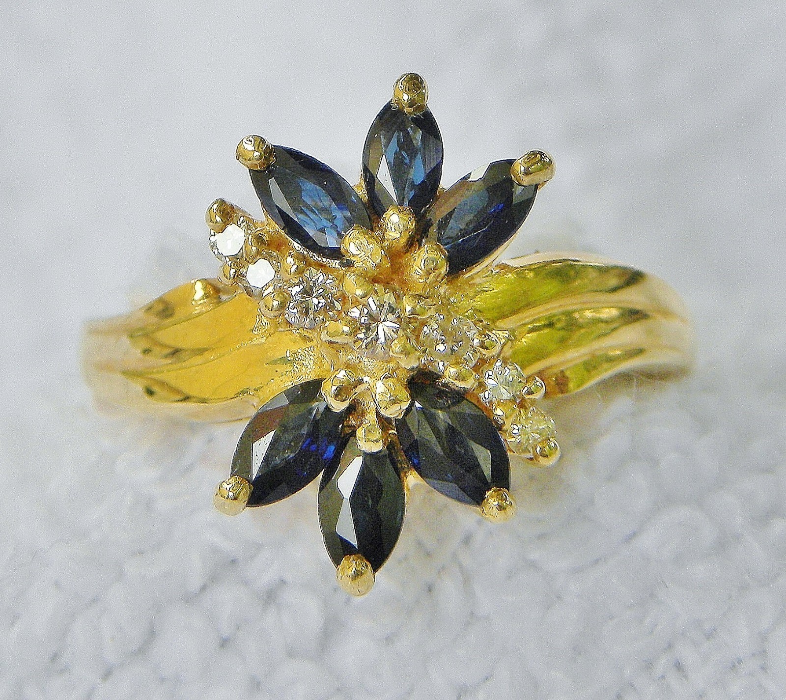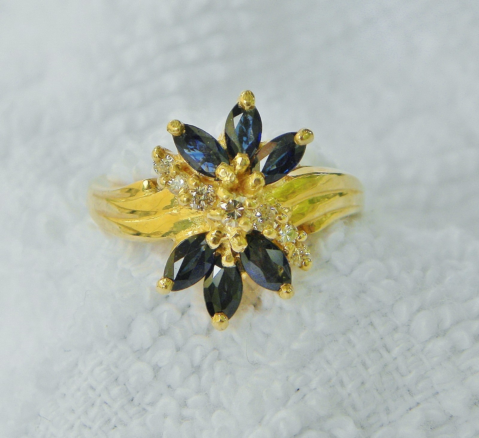 You are viewing an Estate .75 Ctw Natural Marquise Sapphire Ring (6 Stones) with .15 Ctw of Natural rounds Diamonds (7 Stones) in Ladies size 5.75 (approximately). This beautiful Sapphire/Diamond Cocktail Ring is set in a cluster/prong 14kt raised setting. These sparkling sapphire stones are a deep Indigo Blue. The color of the 7 Diamonds that are set in a curved strip between the sapphires are HI and the clarity is SI. The band setting is 3.5 grams of 14 kt gold. The sapphires are VERY Nice! You won't be disappointed! Buy with confidence after checking my feedback. TCW: .90. Sapphire is September's Birthstone.