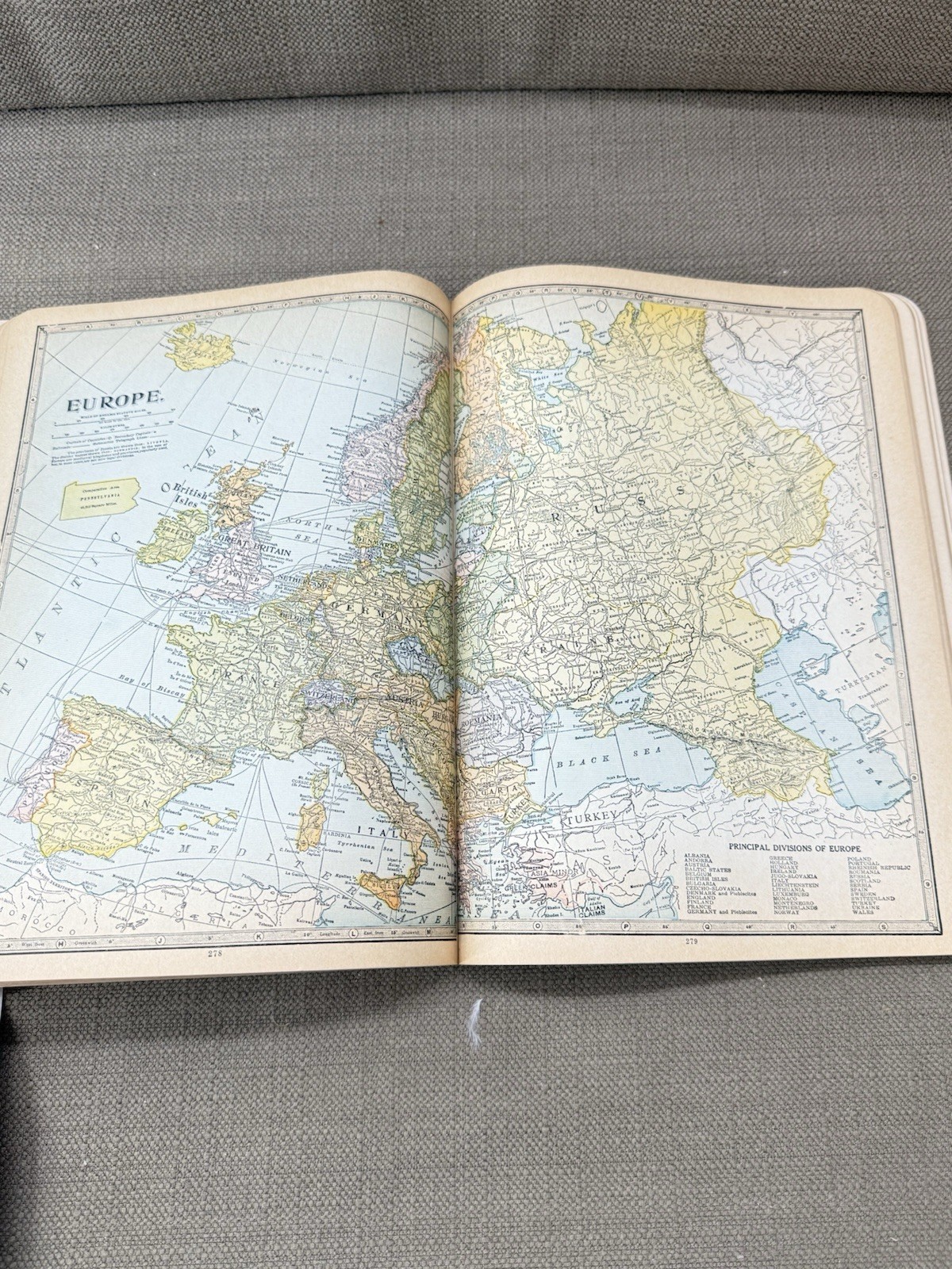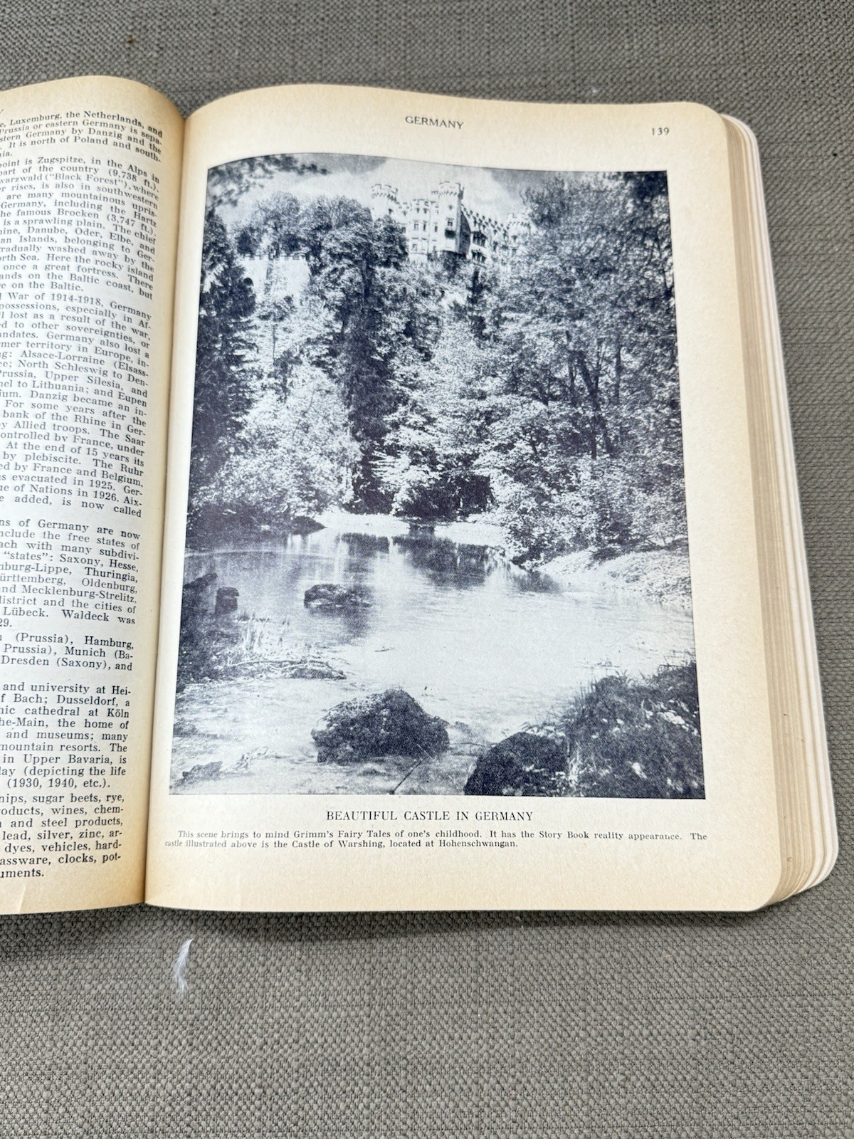 This atlas includes vivid color maps, historical charts, and black-and-white photographs from the early 20th century. A fascinating view of pre?World War II geography, including nations such as Yugoslavia and early borders of Europe, Asia, and North America.