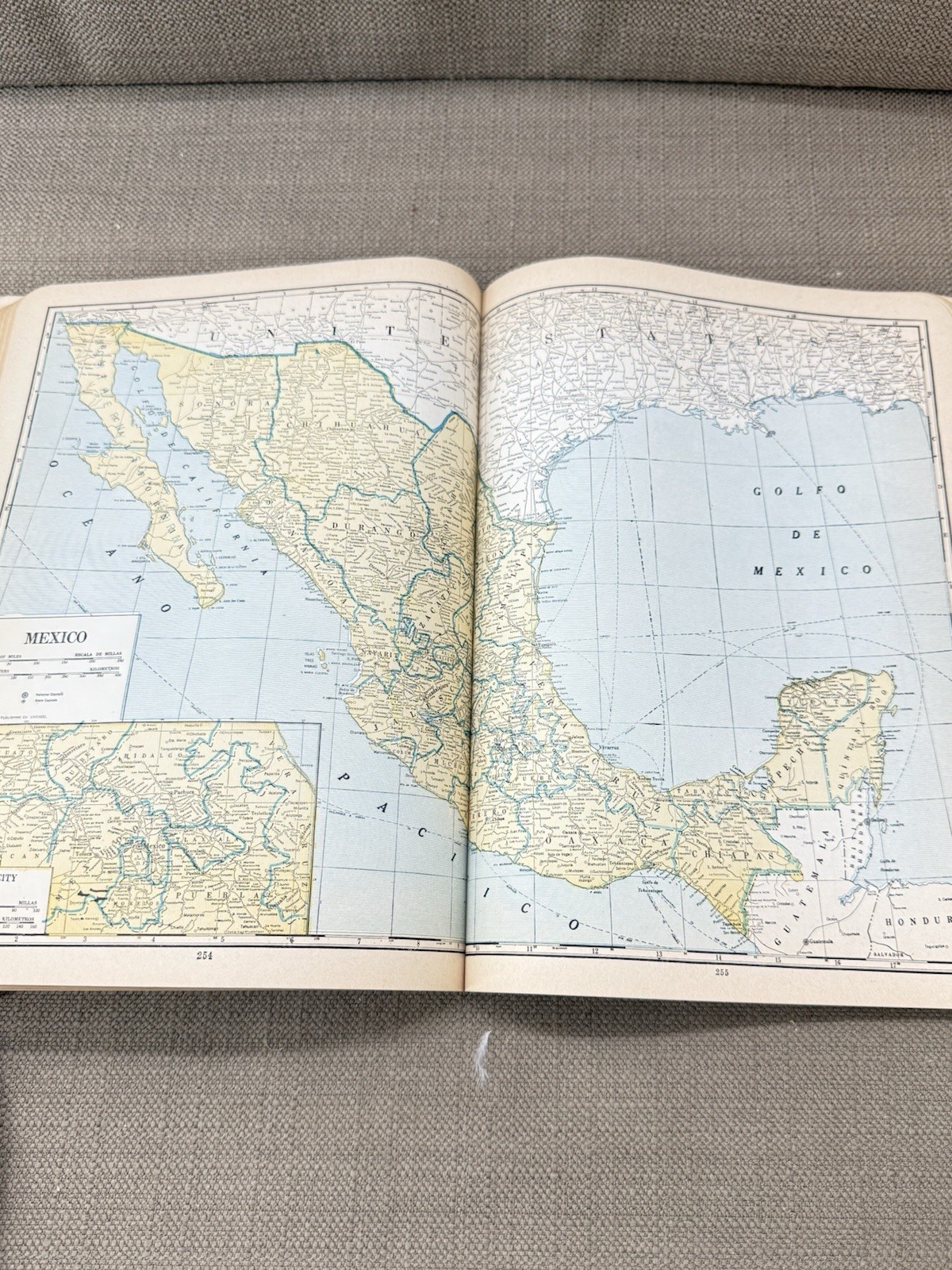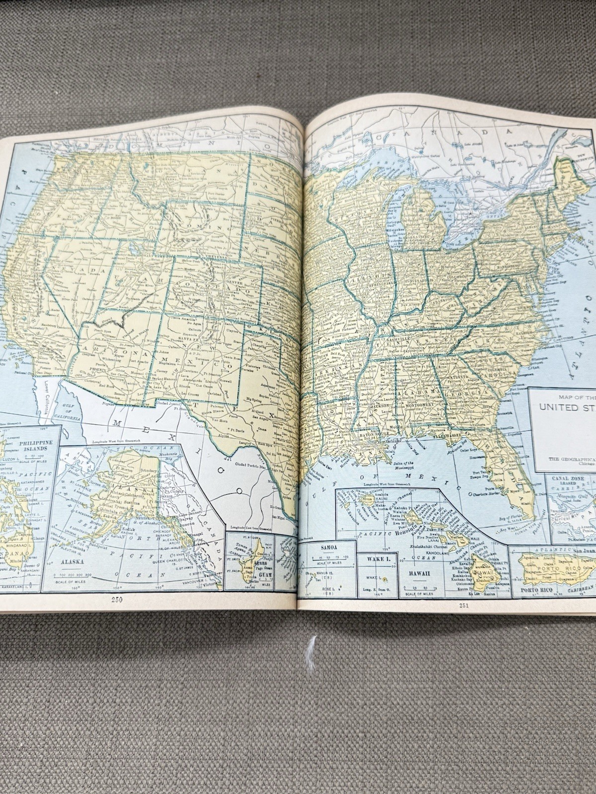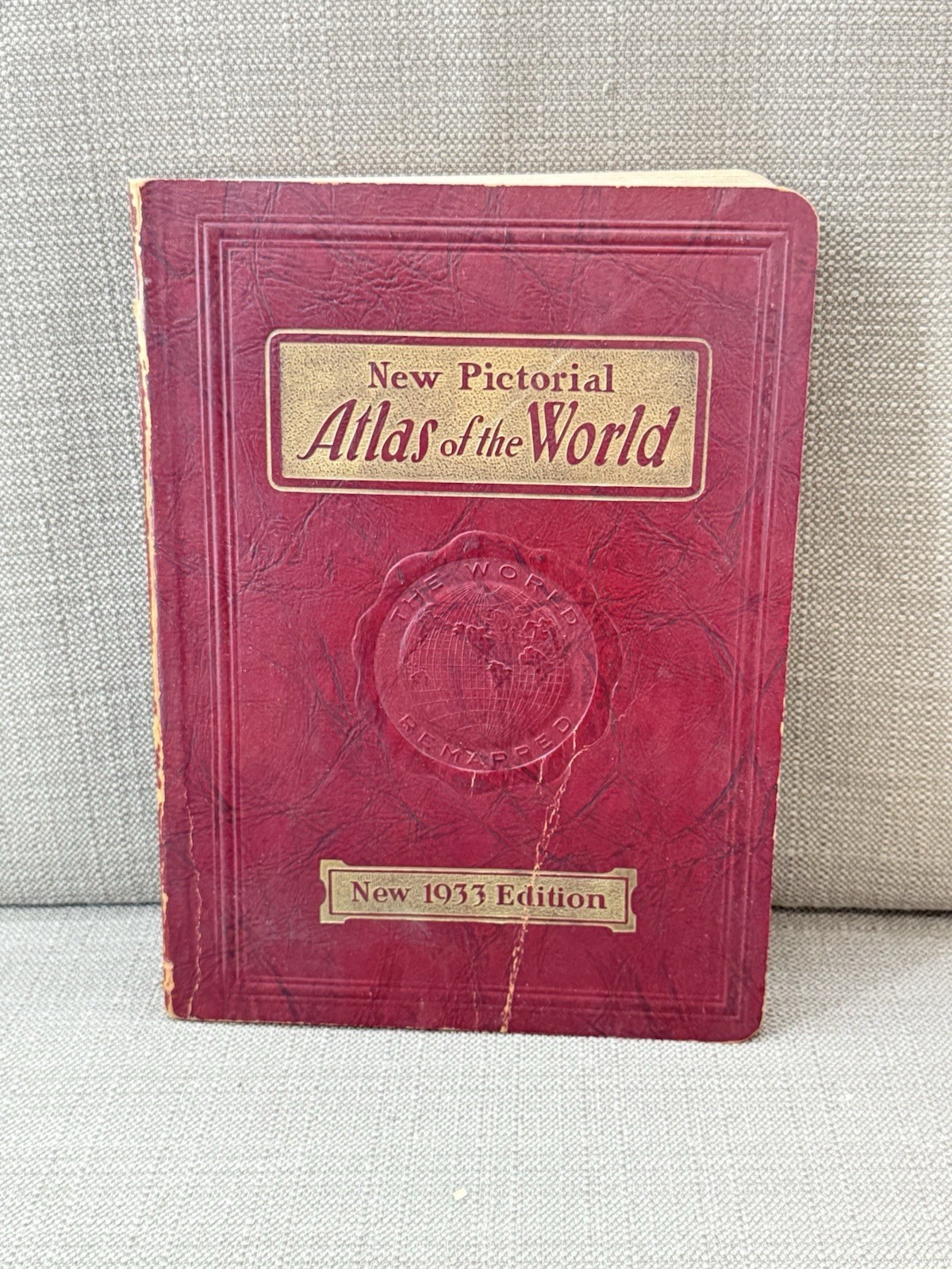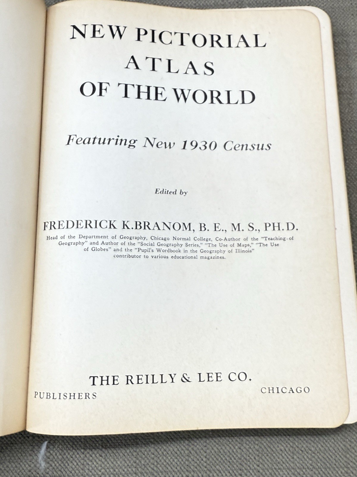 Beautiful 1933 New Pictorial Atlas of the World, featuring data from the 1930 U.S. Census and edited by Frederick K. Branom, Ph.D. Published by The Reilly Lee Company, Chicago, with maps copyrighted in 1932 by The Geographical Publishing Co.