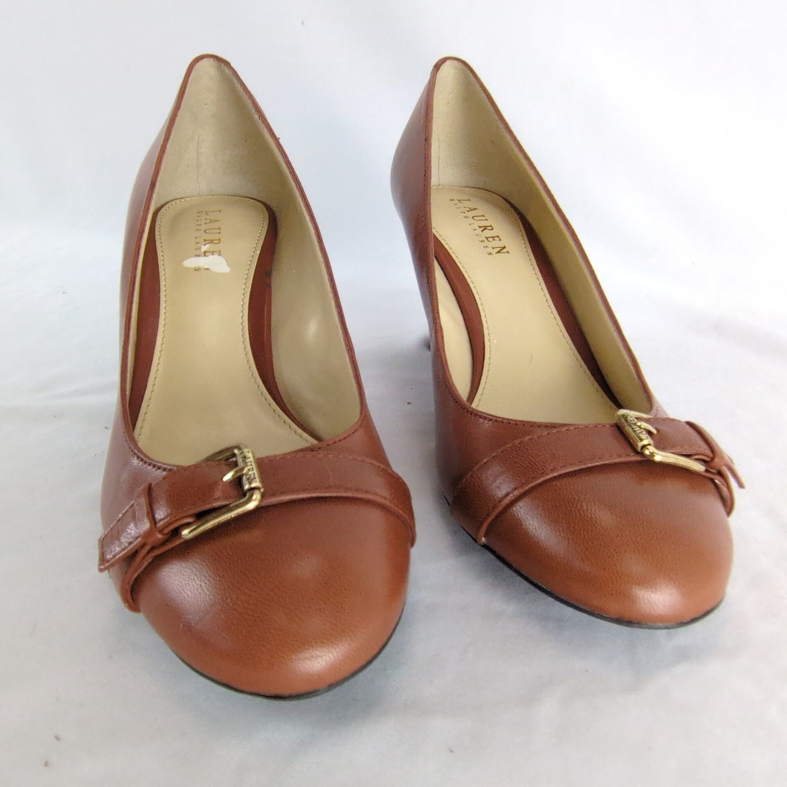 Ralph Lauren Saffron Women's 9B Tan Leather Pumps Gold Buckle 2.75" Heel