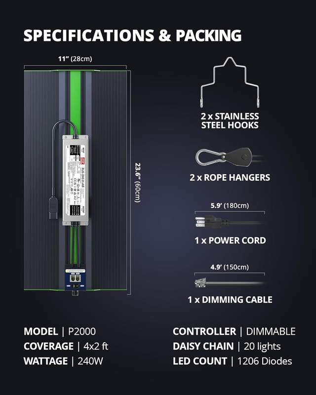 ACCURATE DIMMER FUNCTION DAISY CHAIN FEATURE: An added dimmer knob is featured to precisely manipulate the brightness level of the light, obtaining perfect growth performance for each growing phase. It can completely turn off the light! Daisy chain function allows you to connect up to 20pcs P2000 grow lights for your commercial growing, horizontal and vertical farming, greenhouse planting and hydroponics etc.