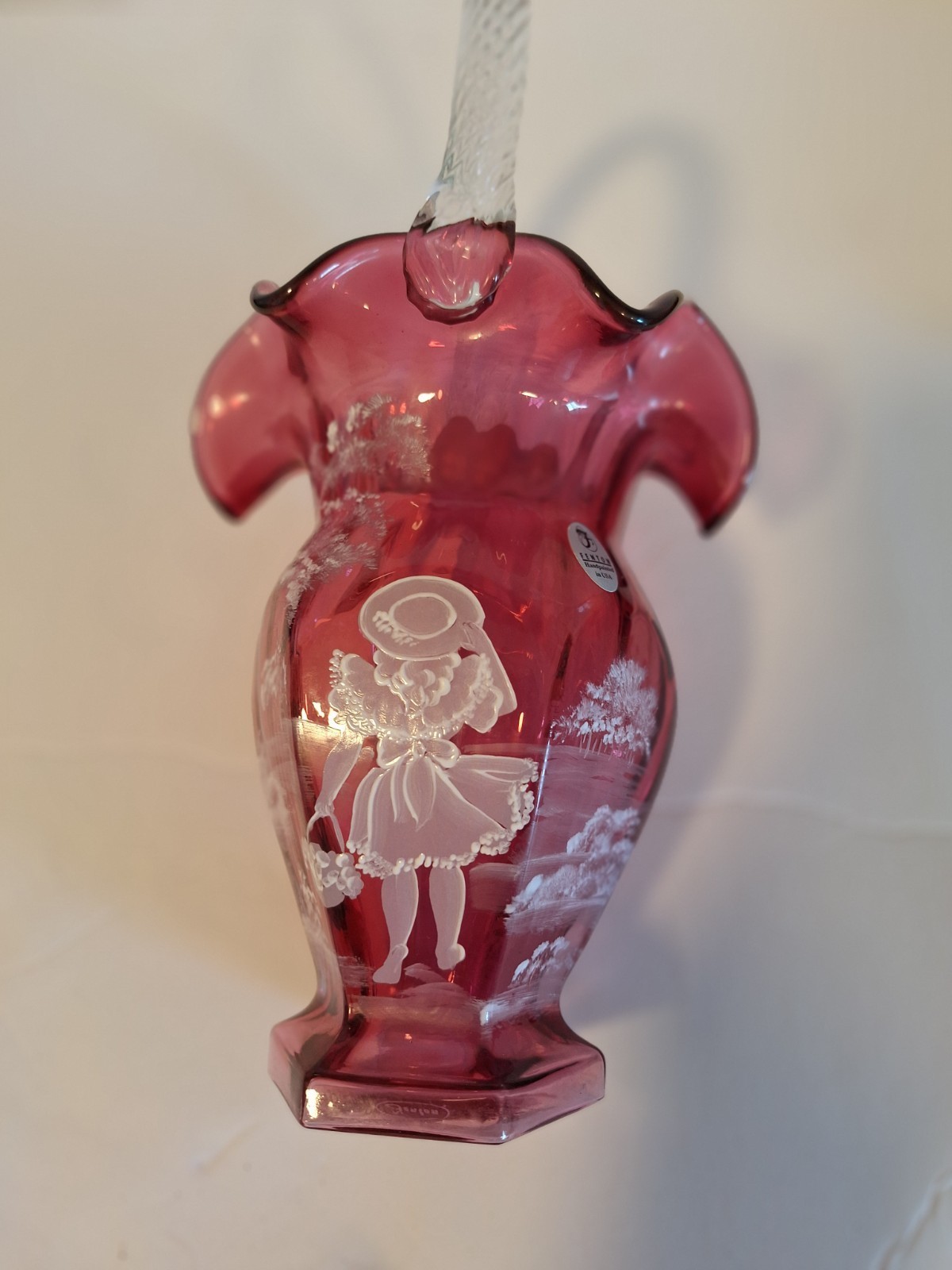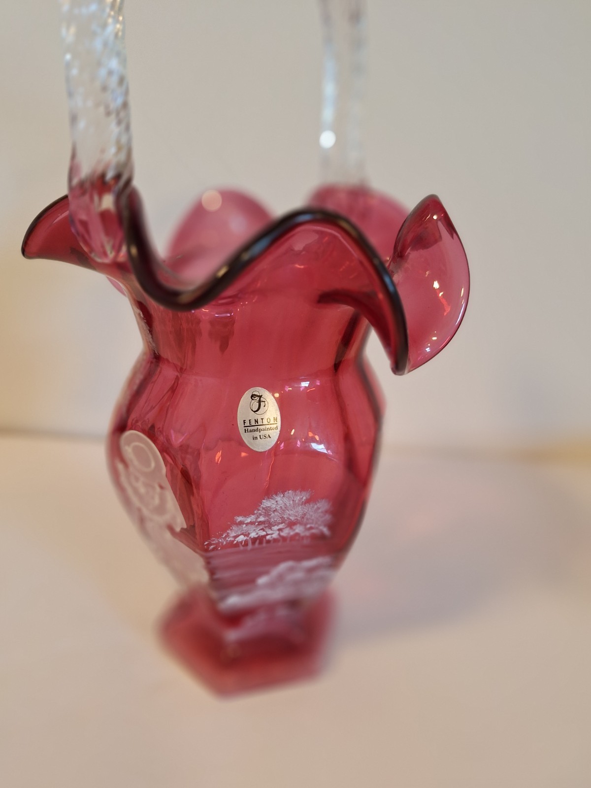Fenton Mary Gregory Collection Cranberry Glass Tall Basket Hand Painted Numbered