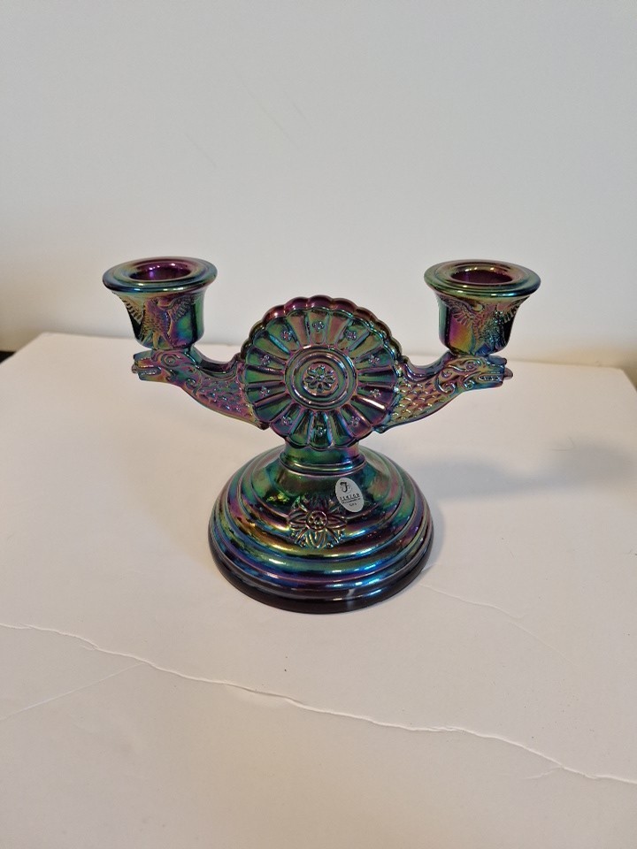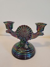 The Fenton Glass 7676 Amethyst Carnival Glass Double Armed Candle Holder is a rare vintage piece from the United States. This handmade glass candle holder features a glossy finish and is suitable for taper/dinner candles. The design incorporates elements of animals and flowers, typical of Fenton's production style. No chips or cracks. Excellent Condition
