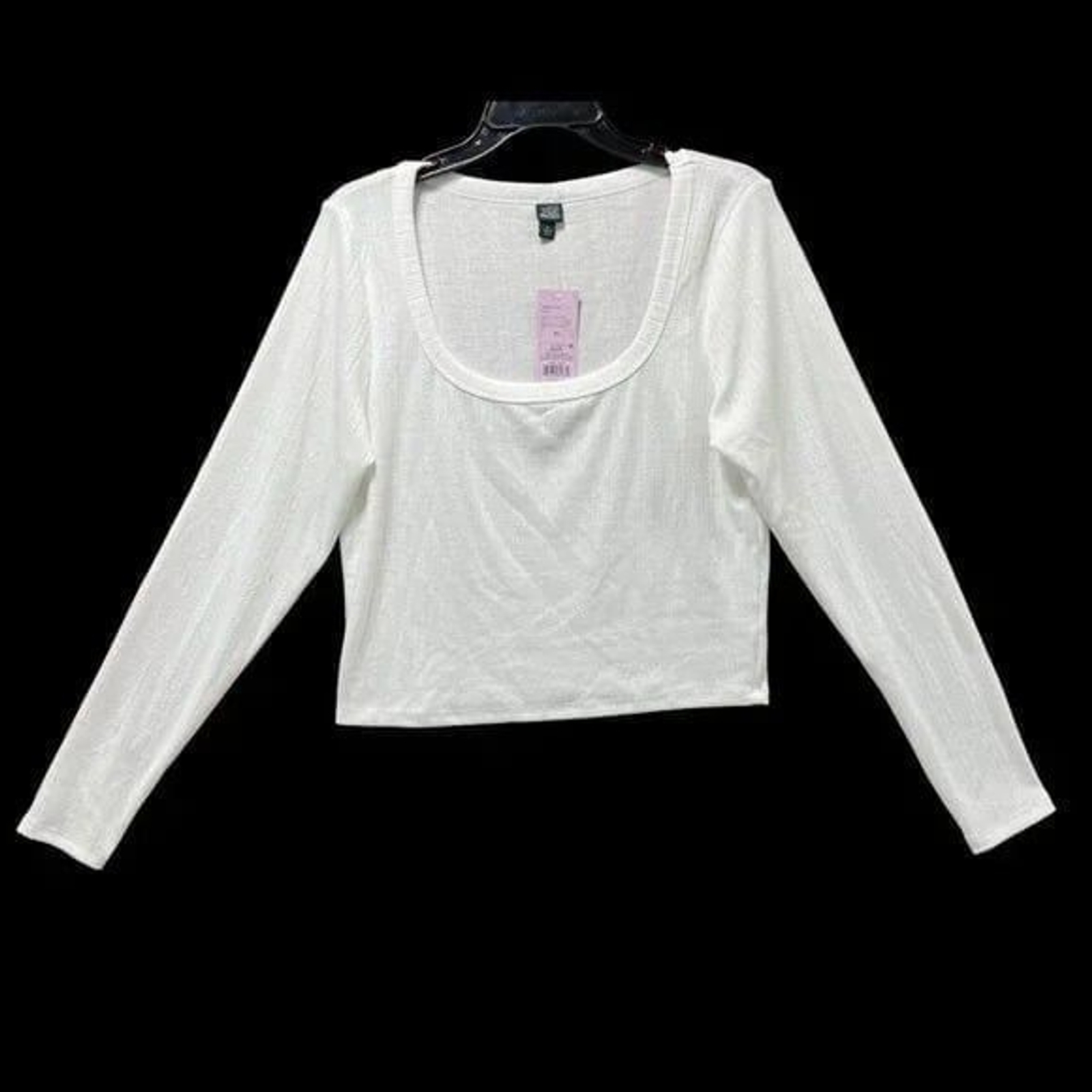 Long-sleeve t-shirt from Wild Fable? with pointelle detailing. Tailored in a slim fit with a mid-length. Made from a soft knit with a hint of stretch for all-day comfort. Designed with a square neckline in a solid hue. White Only!!! Photo of turquoise top is to show how the top looks.