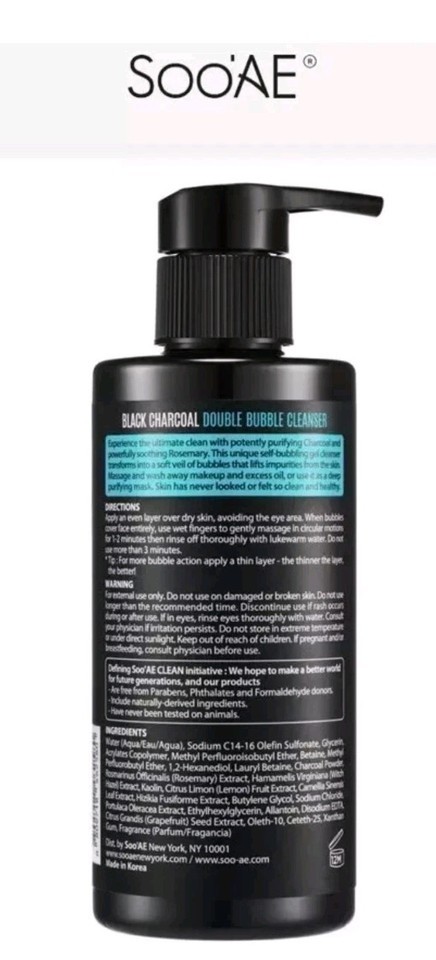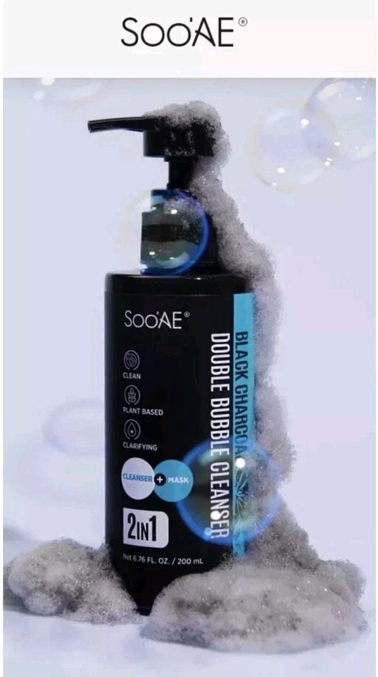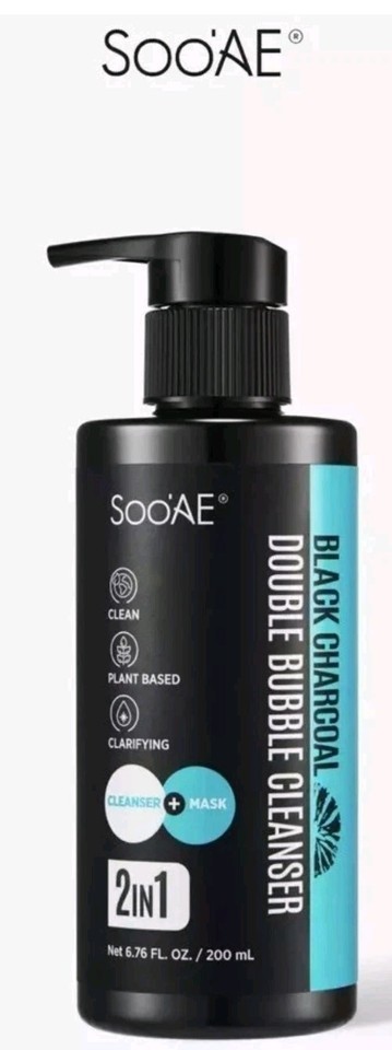 (1) BRAND NEW Soo'AE Black Charcoal Double Bubble Cleanser + Mask 2 in 1 Purifying Skincare 6.76 oz. Bottle