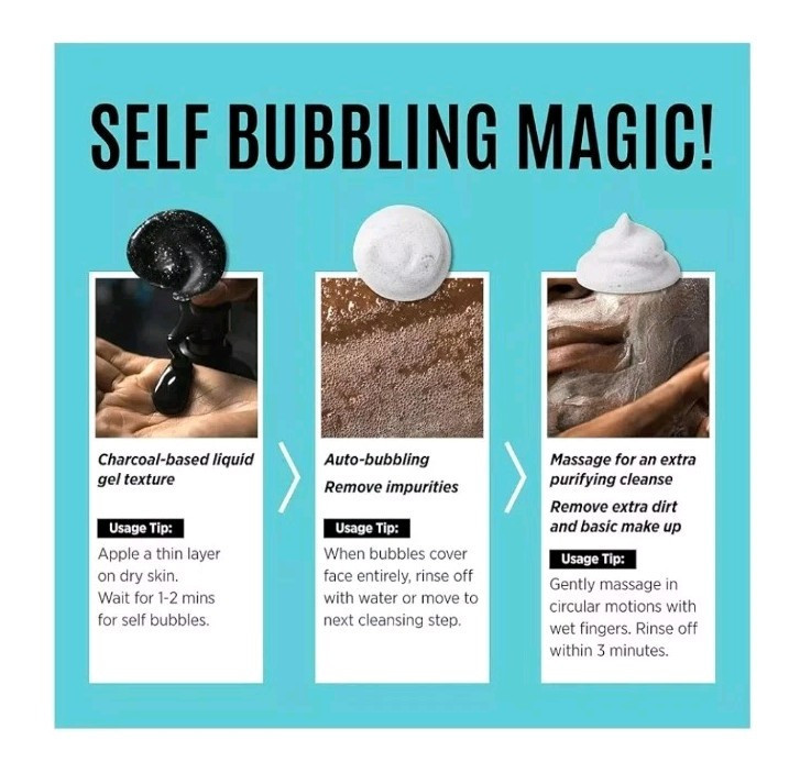 This black charcoal double bubble cleanser, formulated with Charcoal and Rosemary extracts, is a deeply purifying mask and cleanser in one convenient product. The gel textured formula creates rich bubbles on its own, creating a rich lather of micro bubbles that gently yet effectively remove makeup, dirt and other impurities.