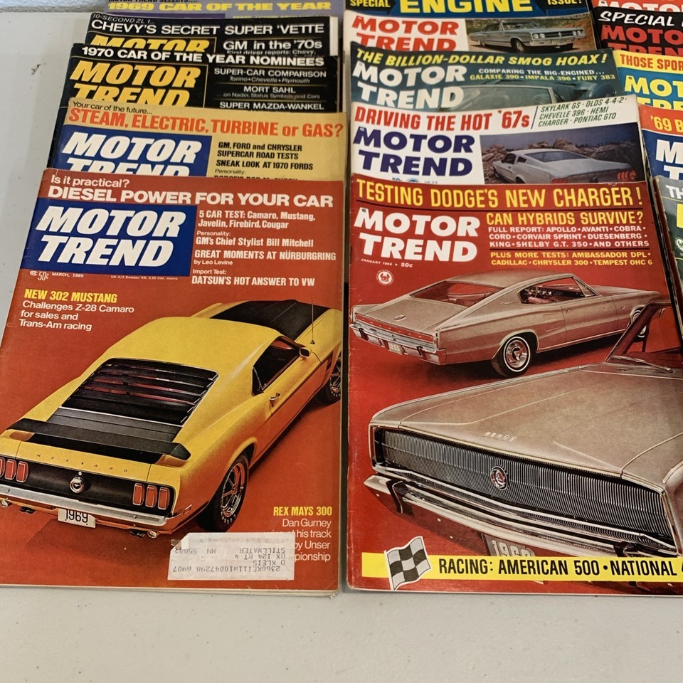 For sale is a large lot of 21 original Motor Trend magazines spanning 1966 to 1969 ? four legendary years that defined the golden age of American performance cars. These issues are packed with original road tests, design previews, vintage car ads, and feature articles showcasing the rise of the Camaro, Mustang, GTO, Charger, and other icons of the muscle-car era.